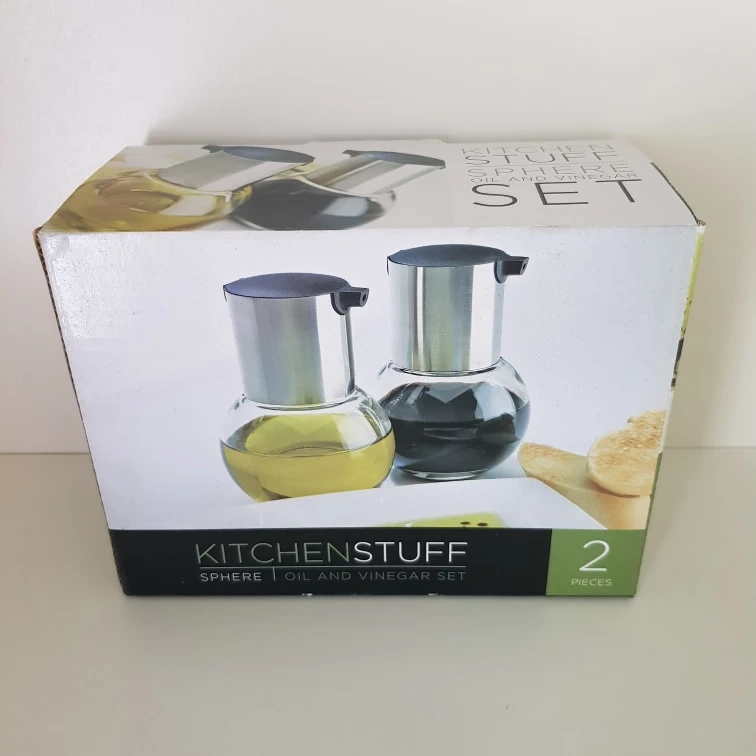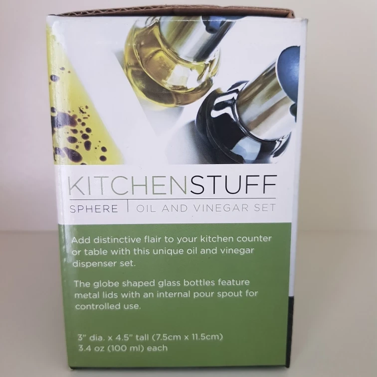 1000+Set of spherical oil and vinegar dispensers each holding 100 mL. Brand new in box Cash only Pickup near or at Cornell Public Library, or Delivery to Markham, Pickering, or Stouffville