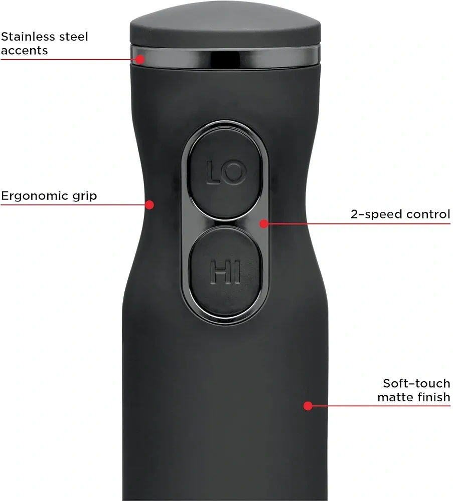 This immersion blender has stainless steel accents and an ergonomic grip with 2-speed control. It features a soft-touch matte finish and stainless steel cross blades for efficient ice crushing. Make smoothies at the push of a button!