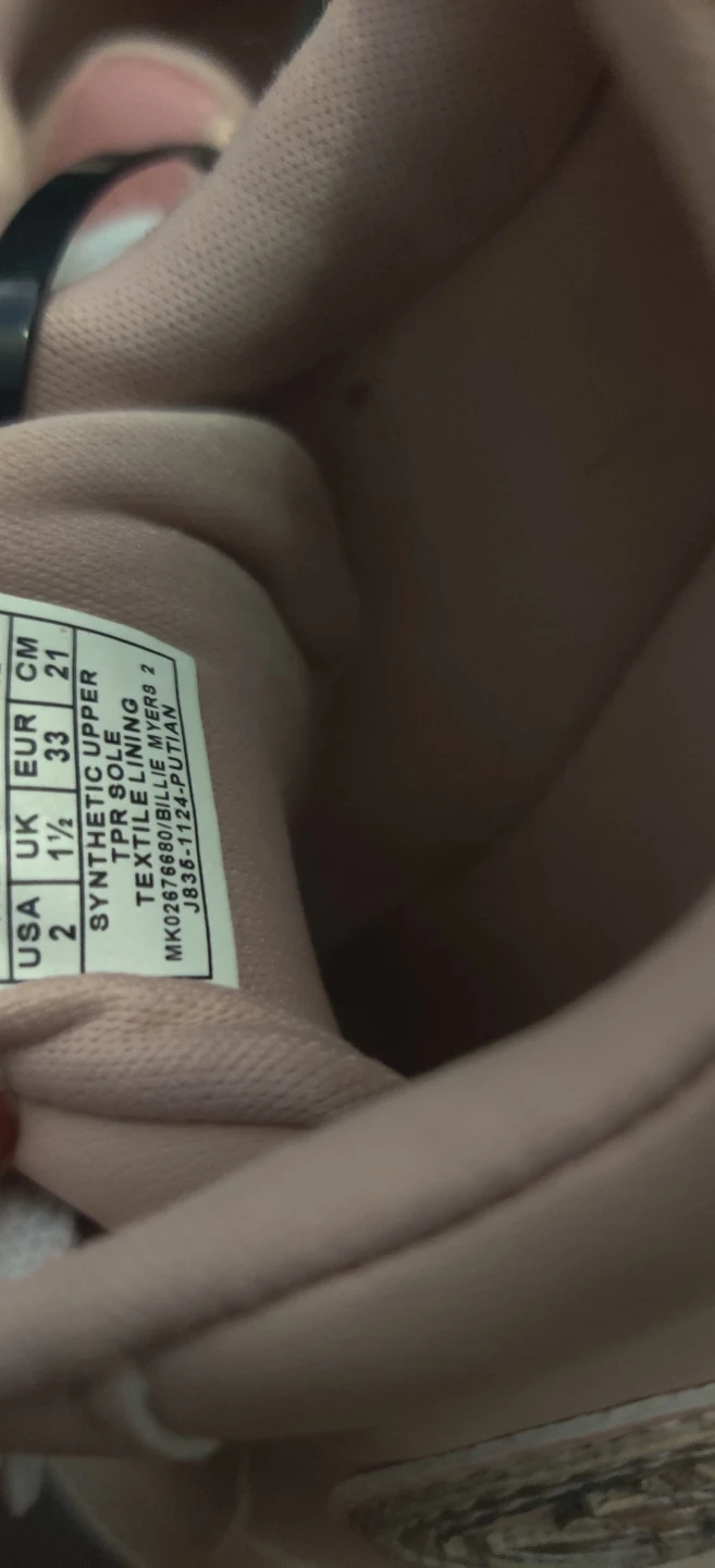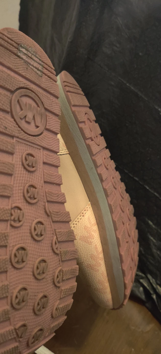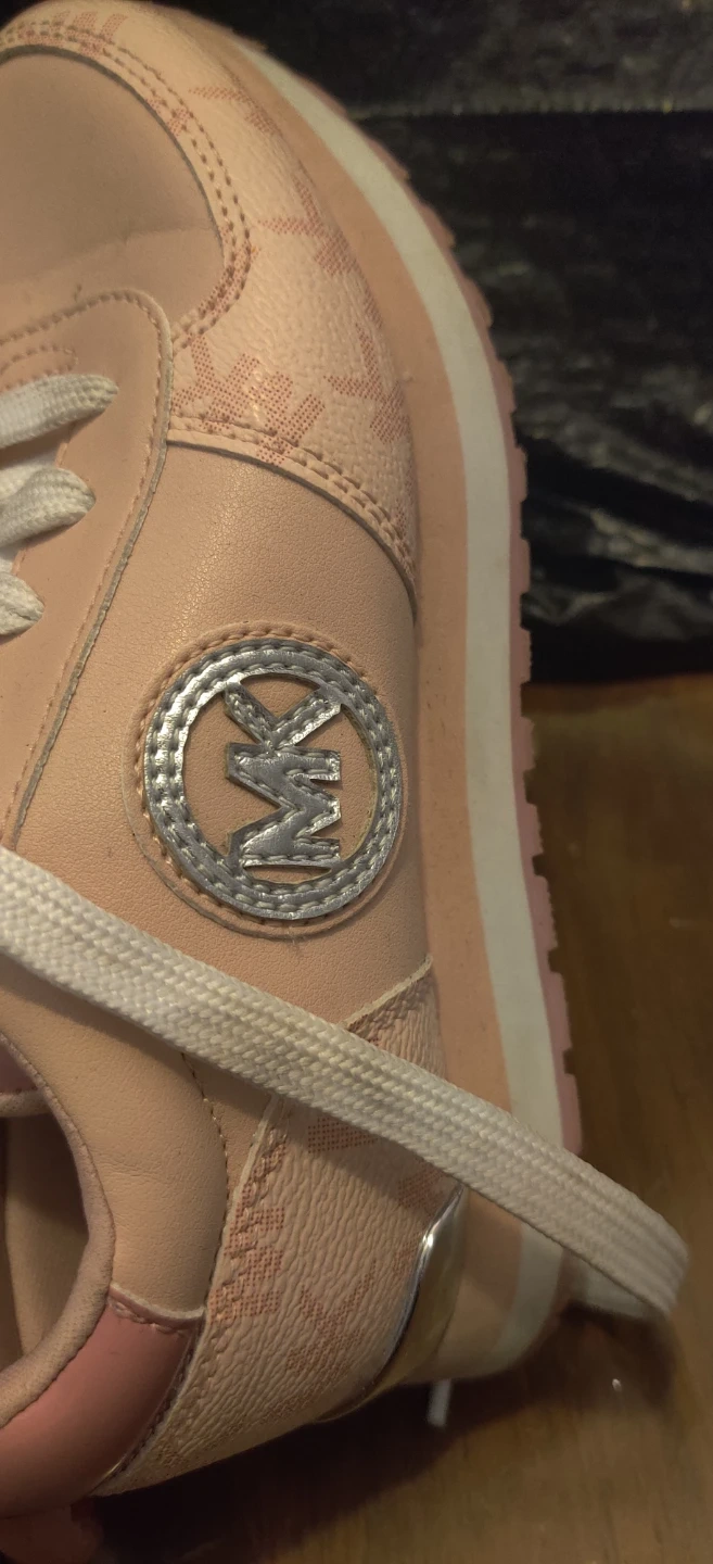 These are pink Michael Kors sneakers with the MK logo pattern. They have a synthetic upper and TPR sole. These shoes are size 2 youth.needs minor cleaning and the brands name on the inside has mostly come off from getting washed
