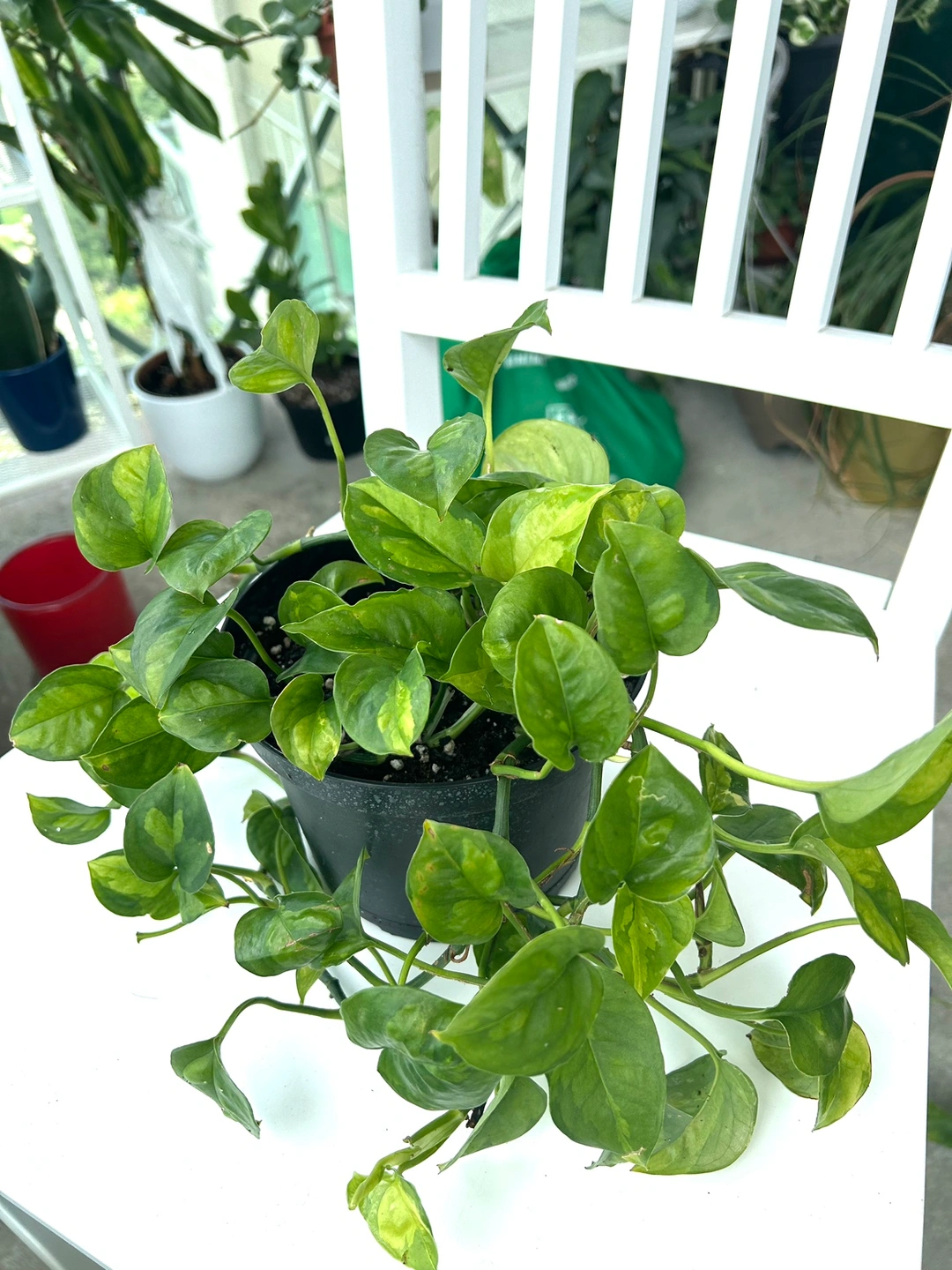 A healthy and thriving pothos plant in a 6-inch pot. This plant has long vines and many leaves. It is a great addition to any home or office.