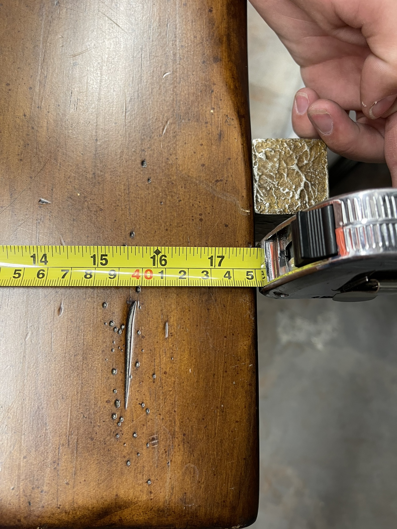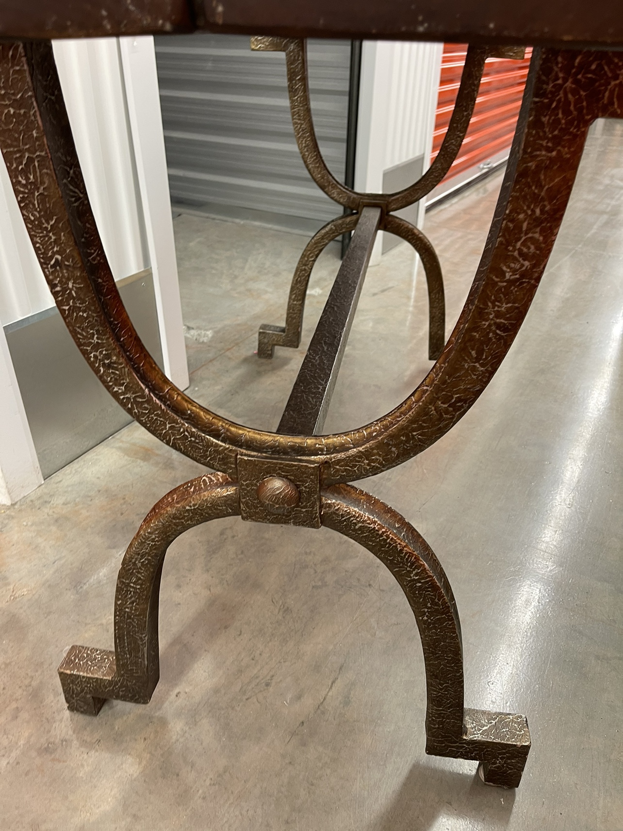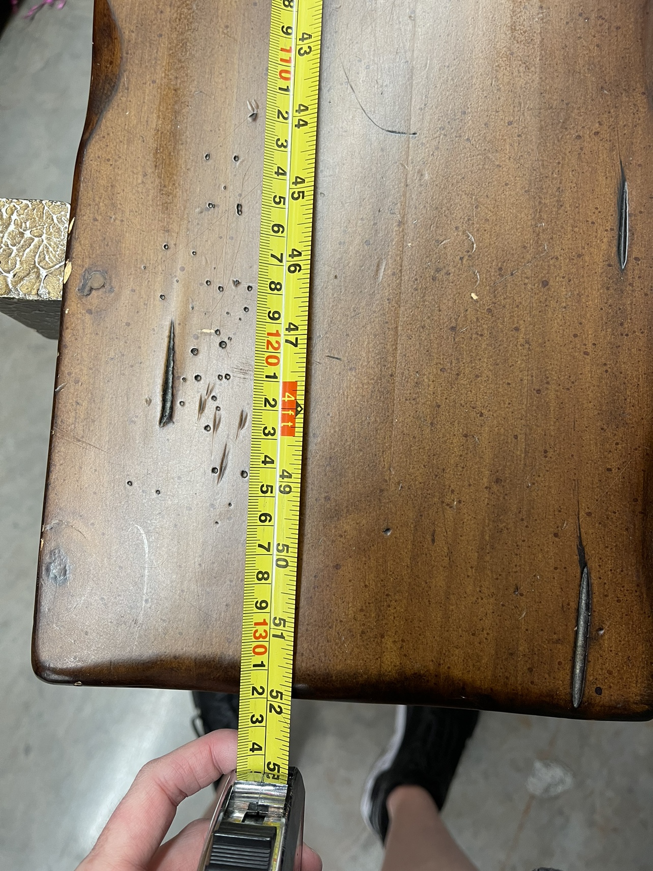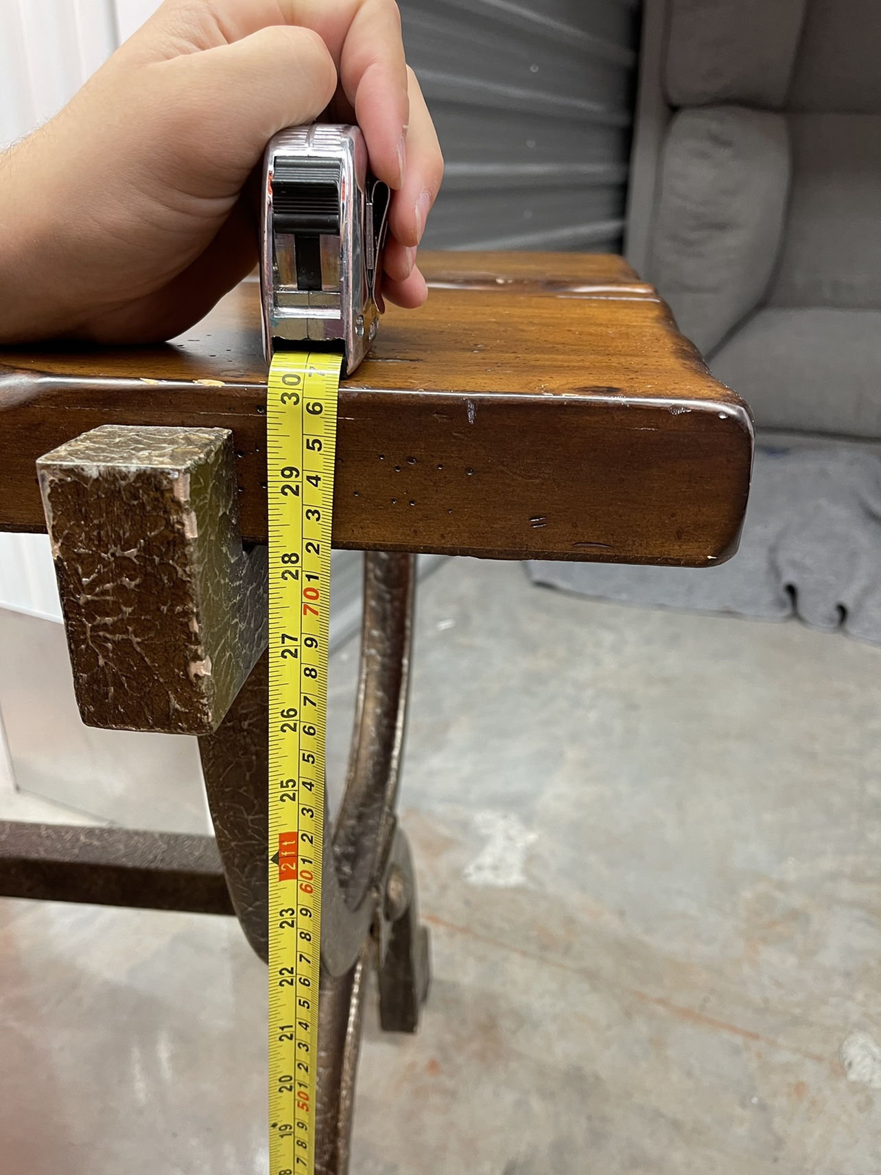 A wooden console/entry way table with a rustic finish and metal legs. It is approximately 18 inches wide, 30 inches high and 52 inches long.