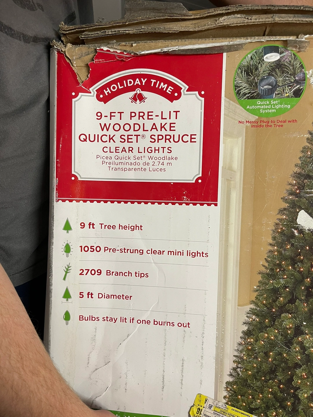 This Christmas tree is 9 ft tall with 1050 pre-strung clear mini lights. The tree has 2709 branch tips and is 5 ft in diameter. This is an absolutely beautiful tree.