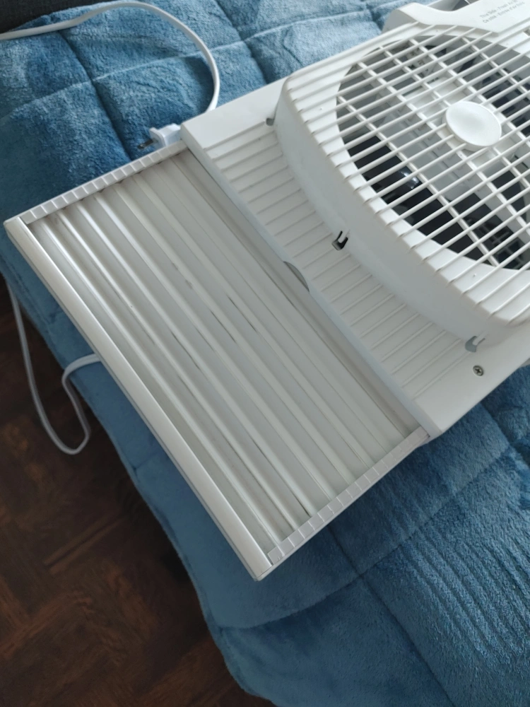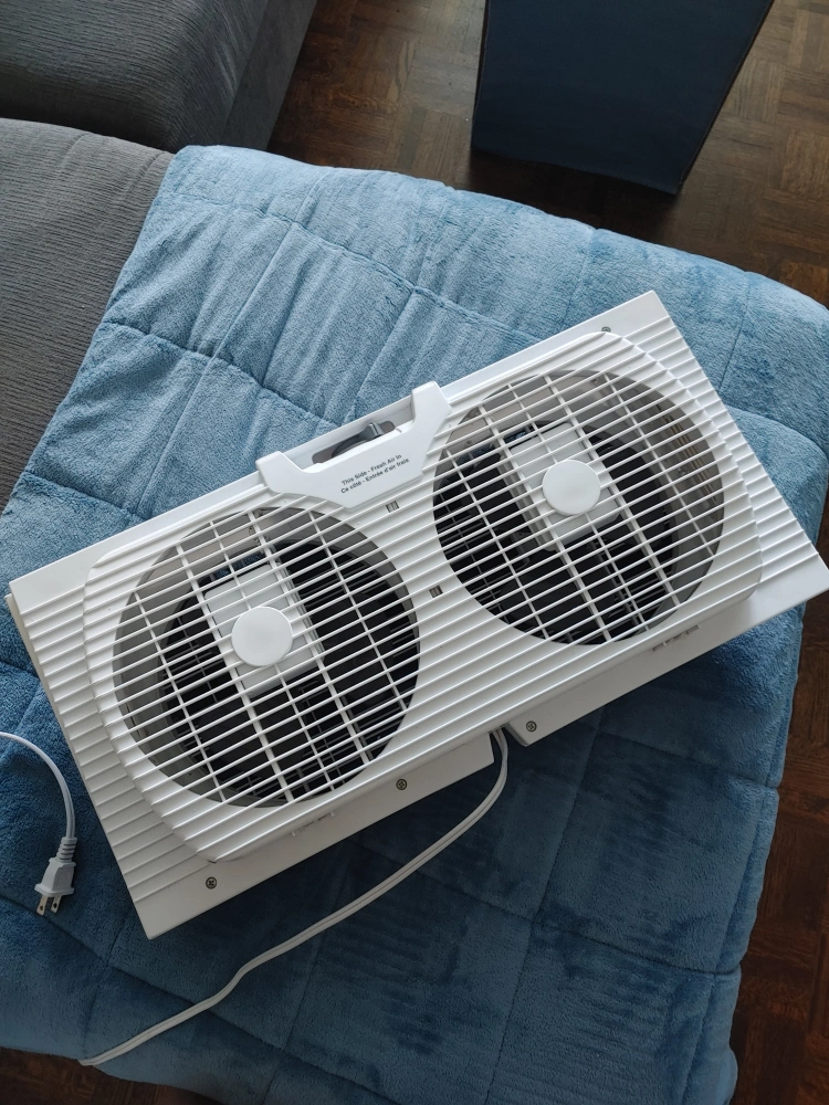 300White window fan with two fans. Expands to fill window space. Meant for sliding or sash windows. 22" x 11"