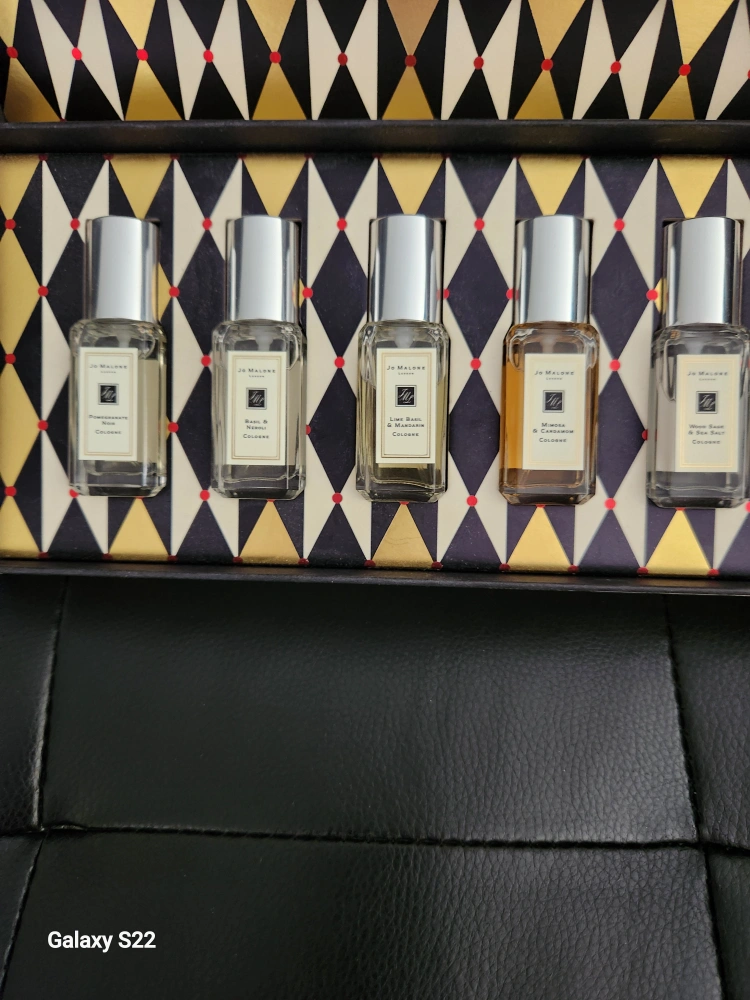 A set of five Jo Malone cologne samples. The set comes in a Jo Malone box. The set includes: Lime Basil & Mandarin, Wood Sage & Sea Salt, Pomegranate Noir, Mimosa and Cardamom, Vasil and Neroli. all 9ml. each.