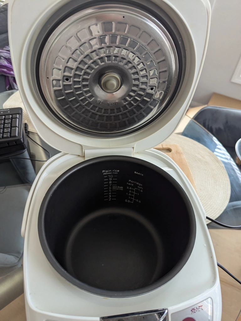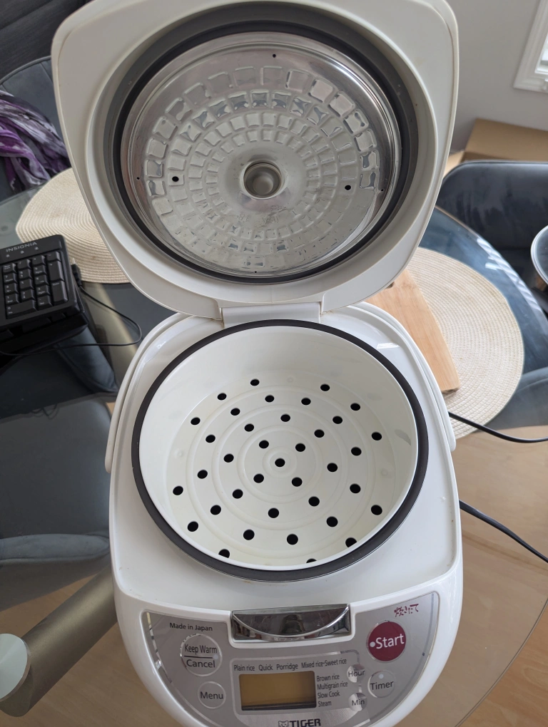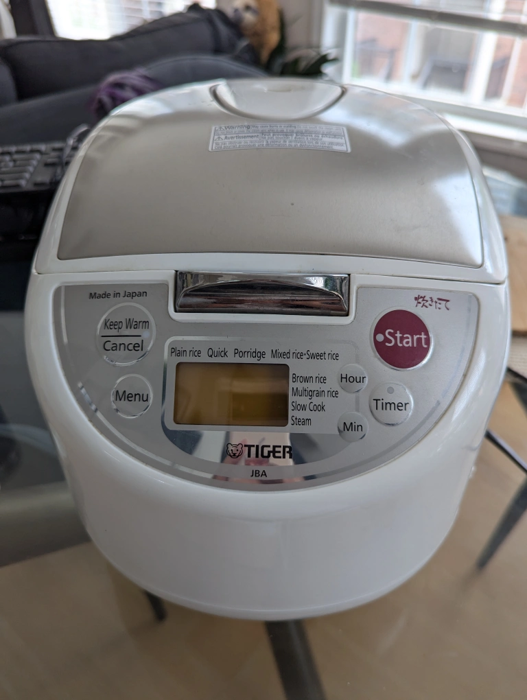 Rice cooker works really well and is still in excellent condition. We are only selling it as it is too big for our current kitchen and had downsized to a smaller rice cooker.