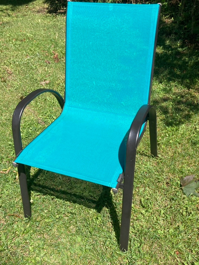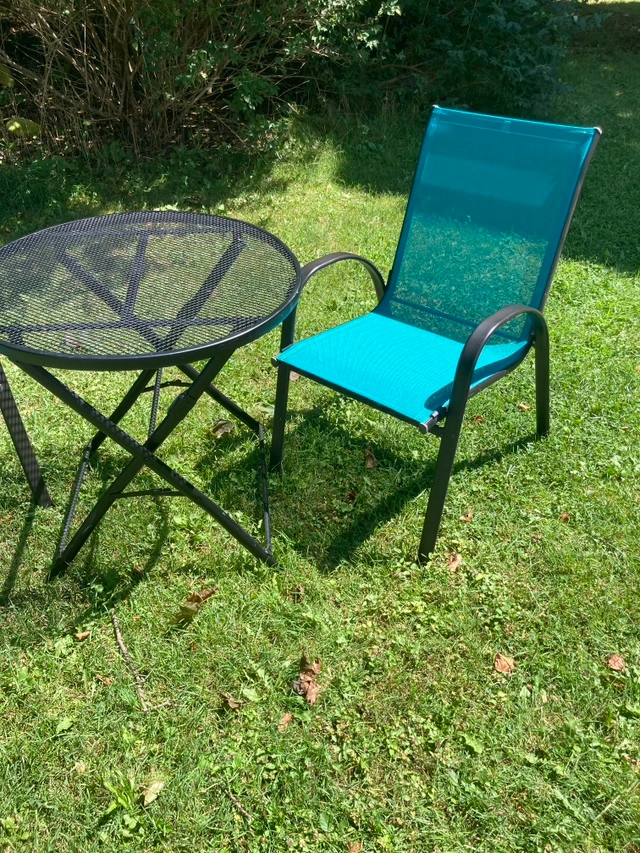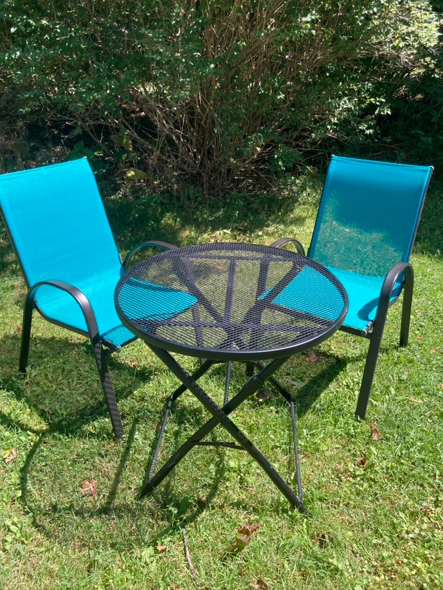Black Metal Patio Set with Two Teal Chairs and a Round folding table .