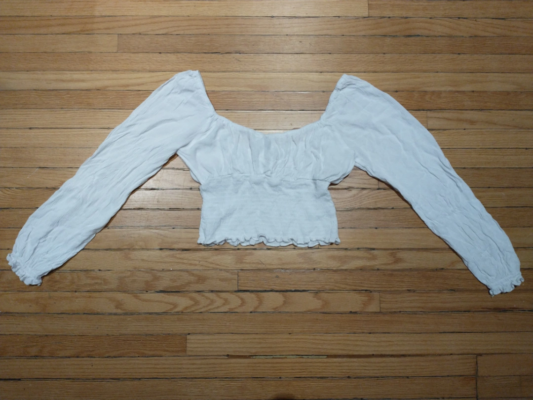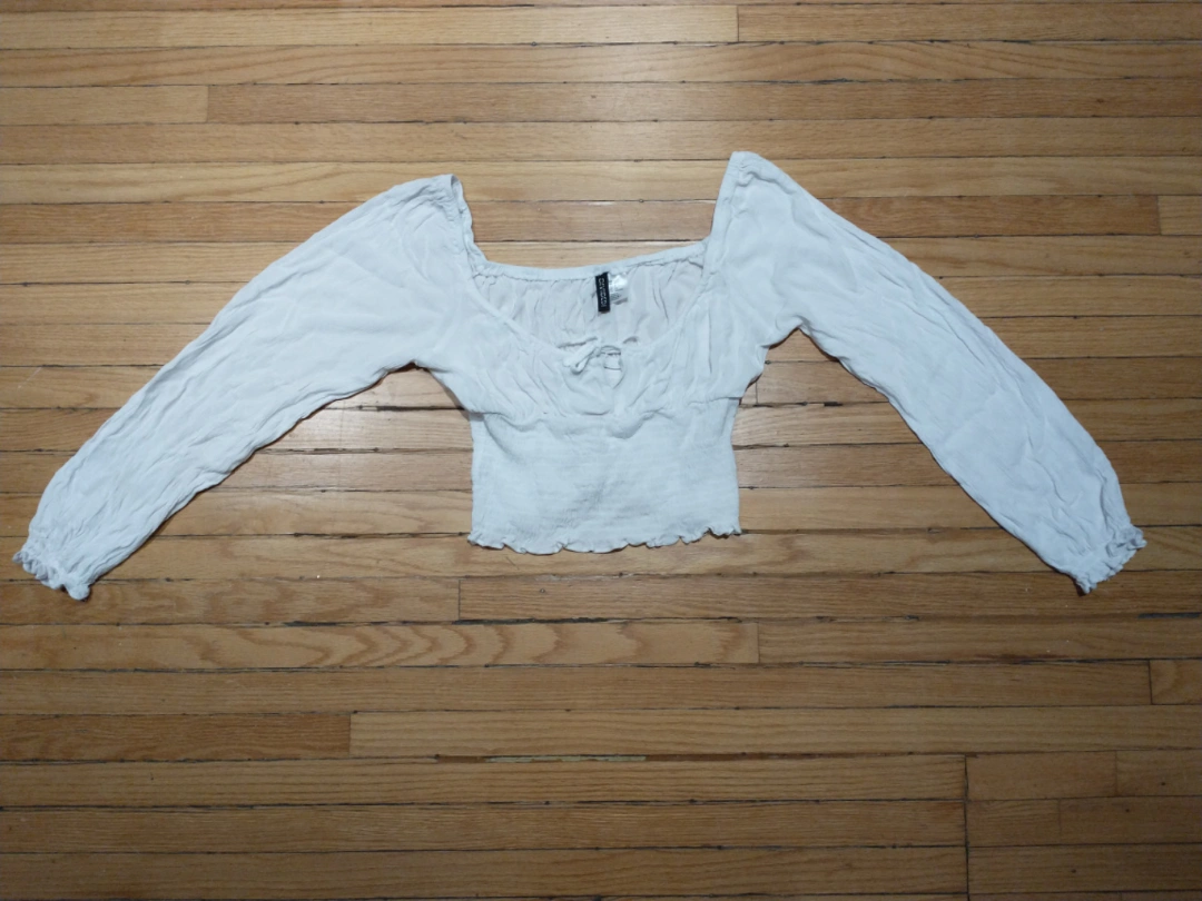 524White long-sleeved top with a gathered bodice and tied front closure Smoke free home Cash payment please