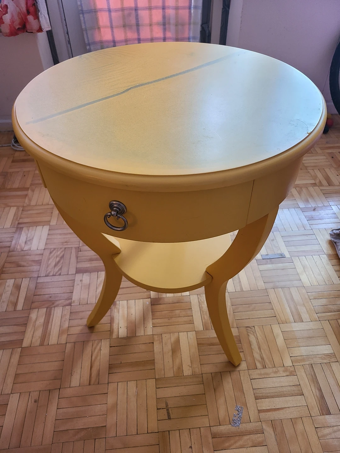 Yellow, distressed top, Gorgeous Wooden Side Table, 3 curved legs with Drawer and 2nd shelf