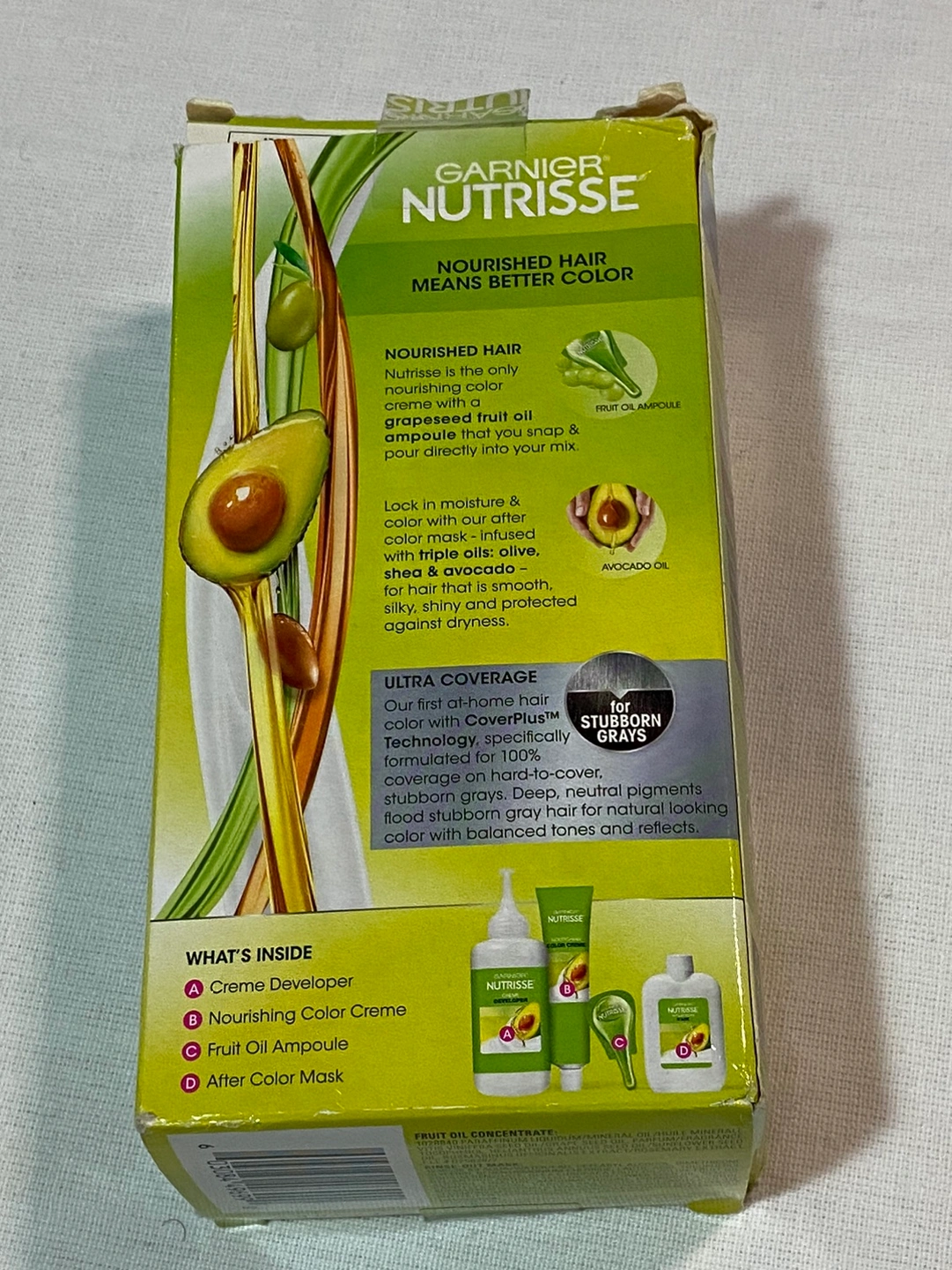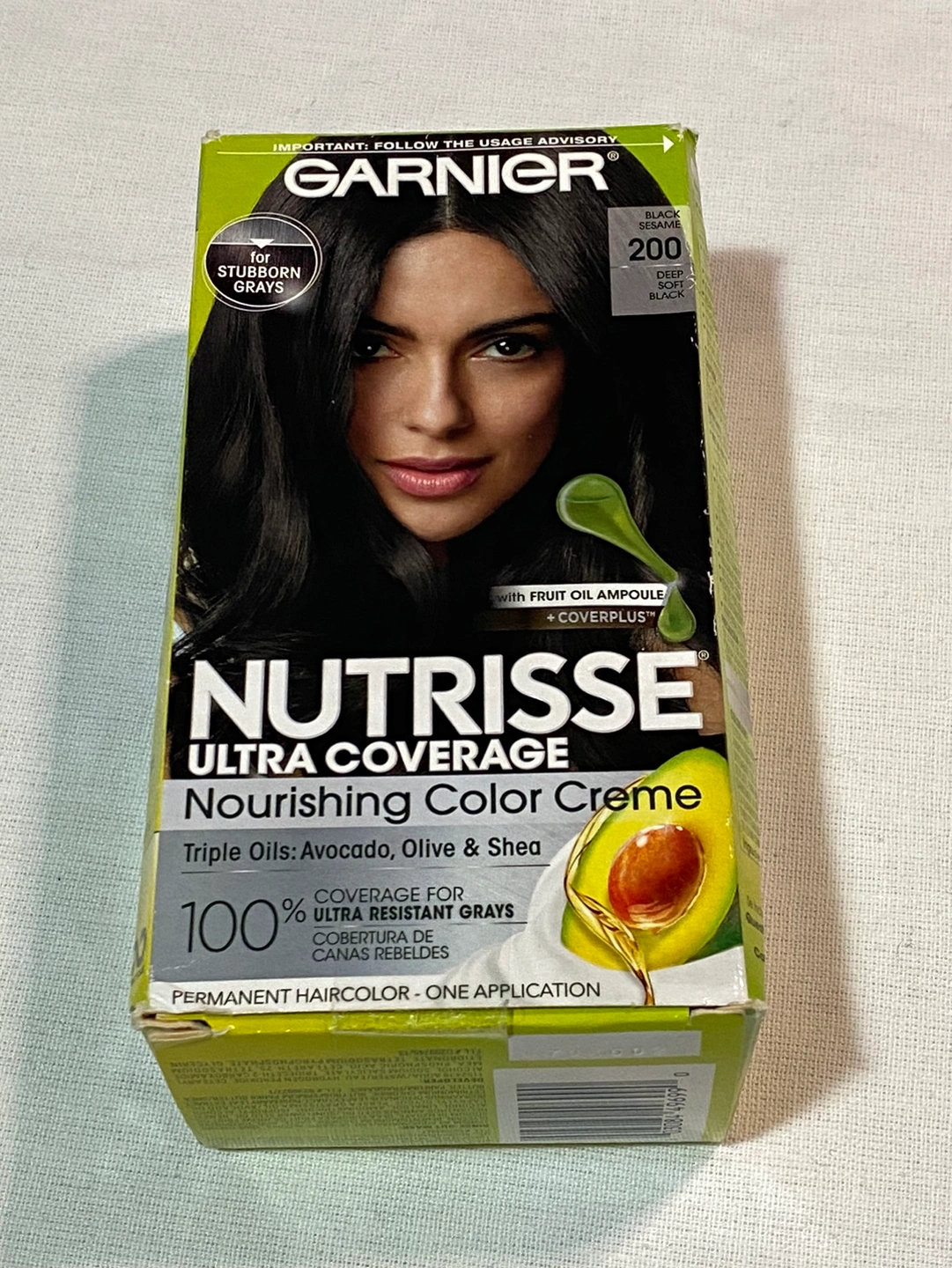 This is a box of Garnier Nutrisse Ultra Coverage Creme Hair Colour in shade 200 Deep Black. This product contains one application and is designed for stubborn grays.