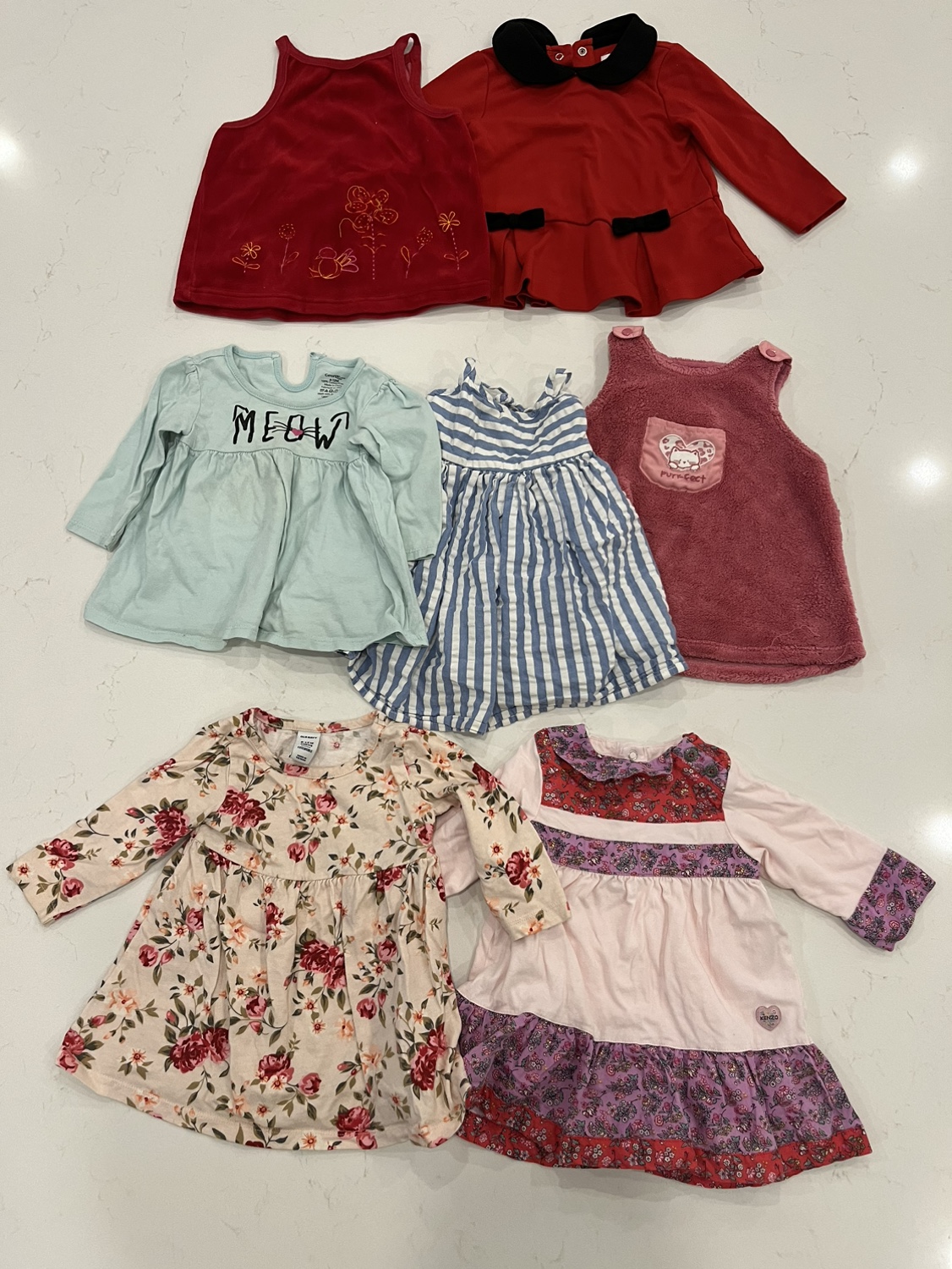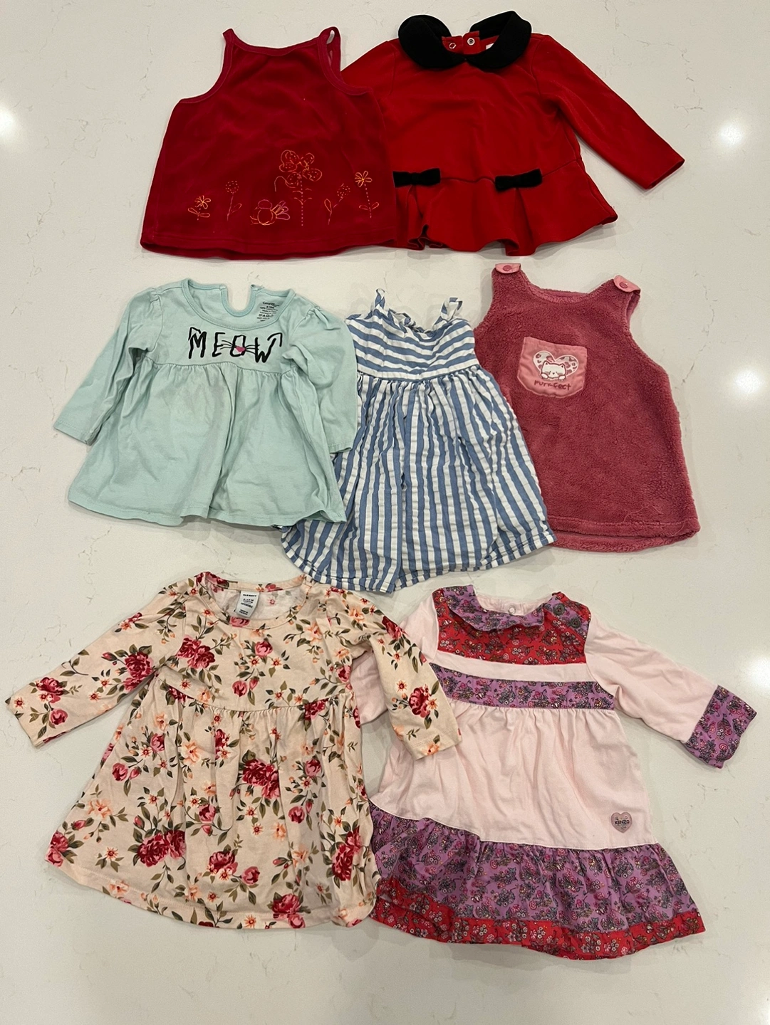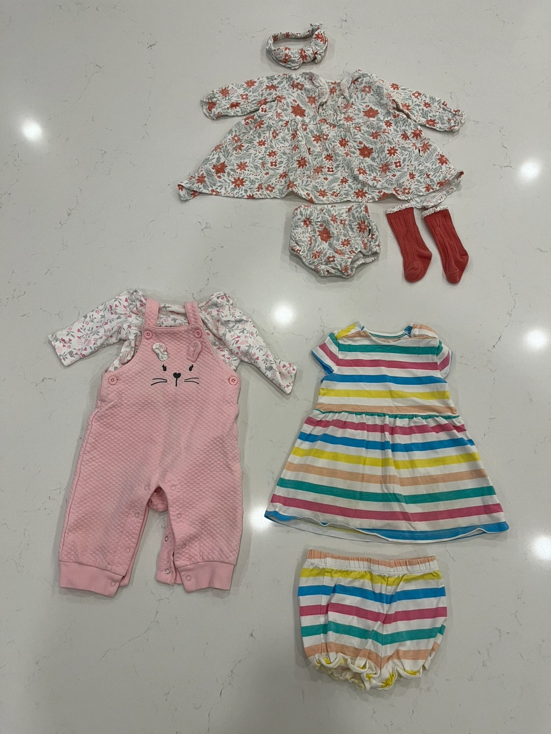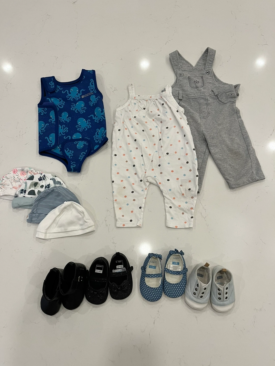 A large bundle of baby girl clothes (as pictured). Including dresses, tops, pants, shorts, rompers, a wetsuit, shoes, headband, and hats. Almost everything you need to clothe your baby from 6-9 months.