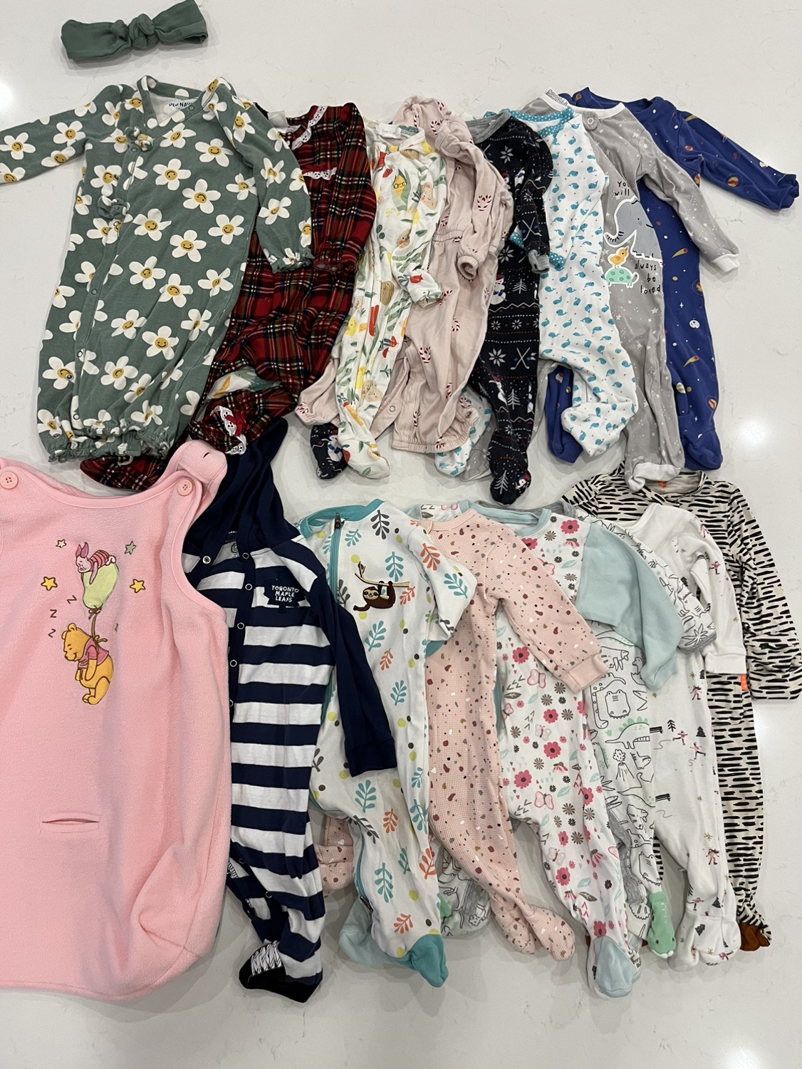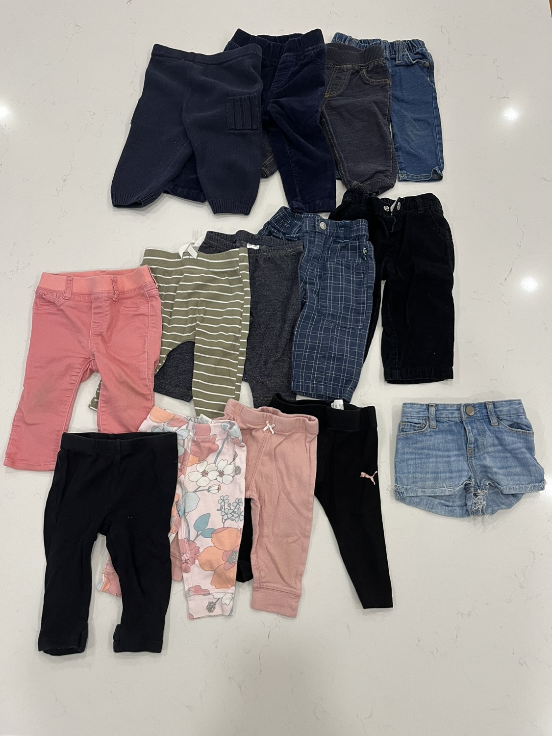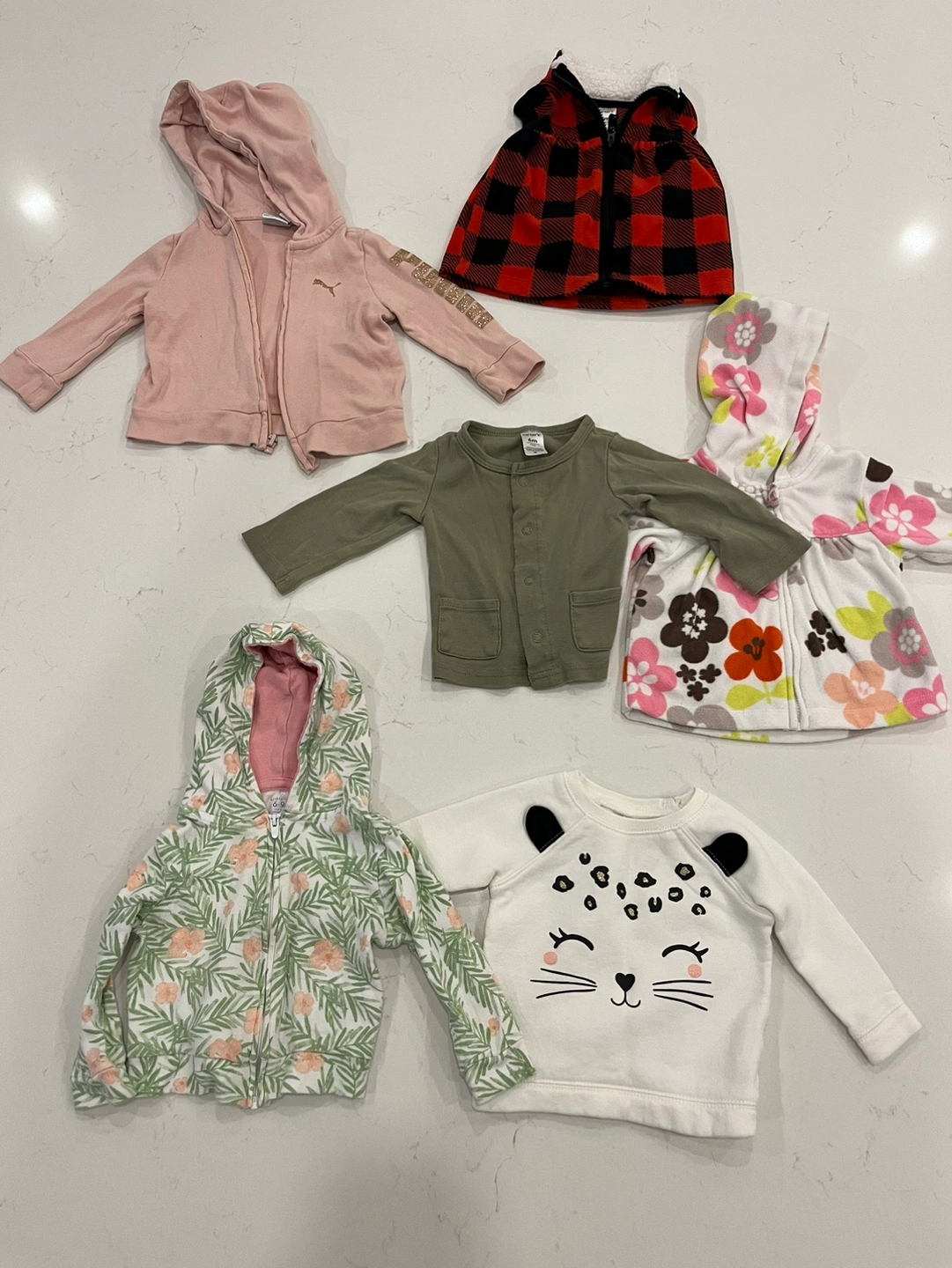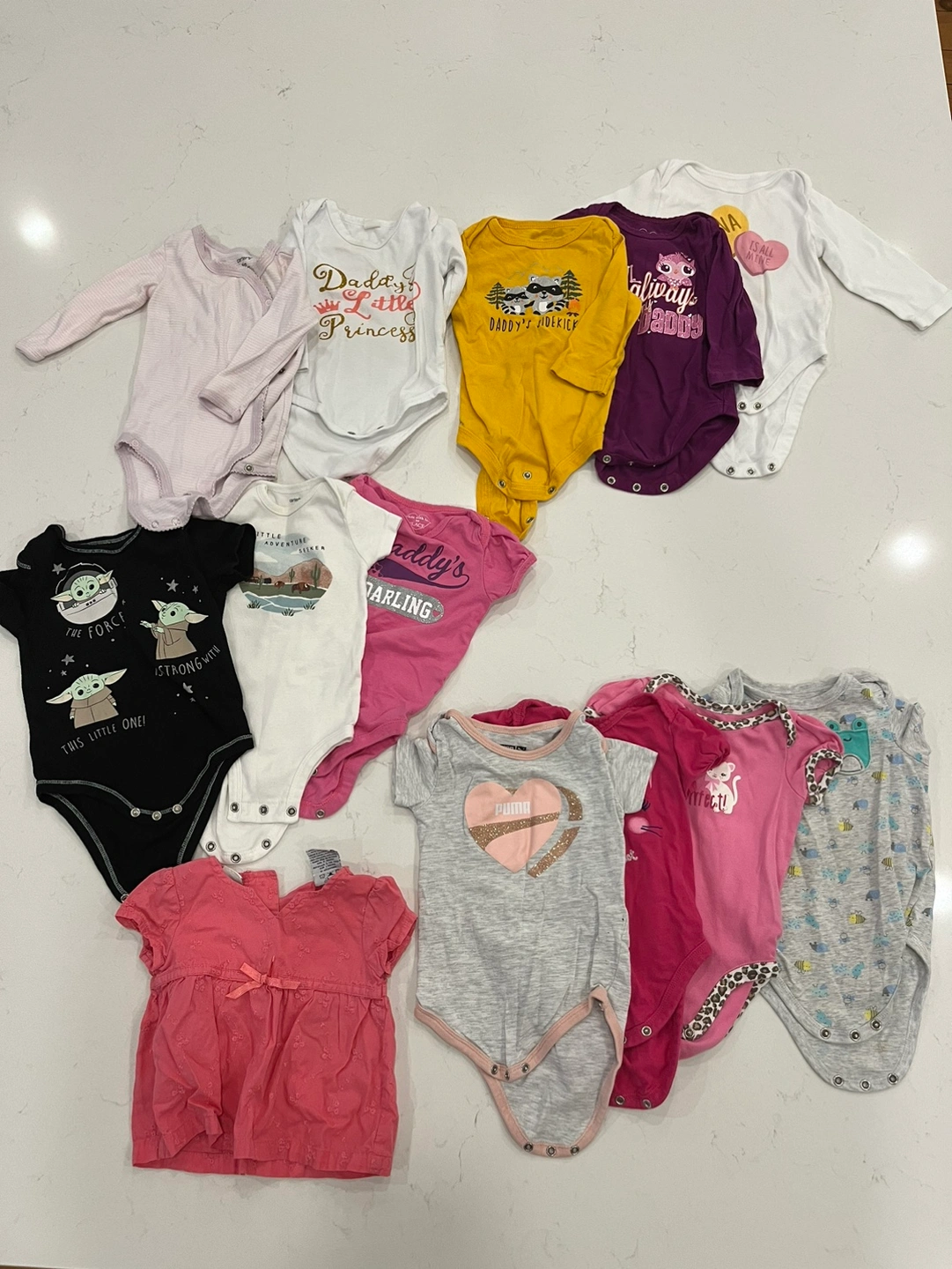 A large bundle of baby girl clothes (as pictured). Including dresses, tops, pants, shorts, rompers, a wetsuit, shoes, headband, and hats. Almost everything you need to clothe your baby from 6-9 months.
