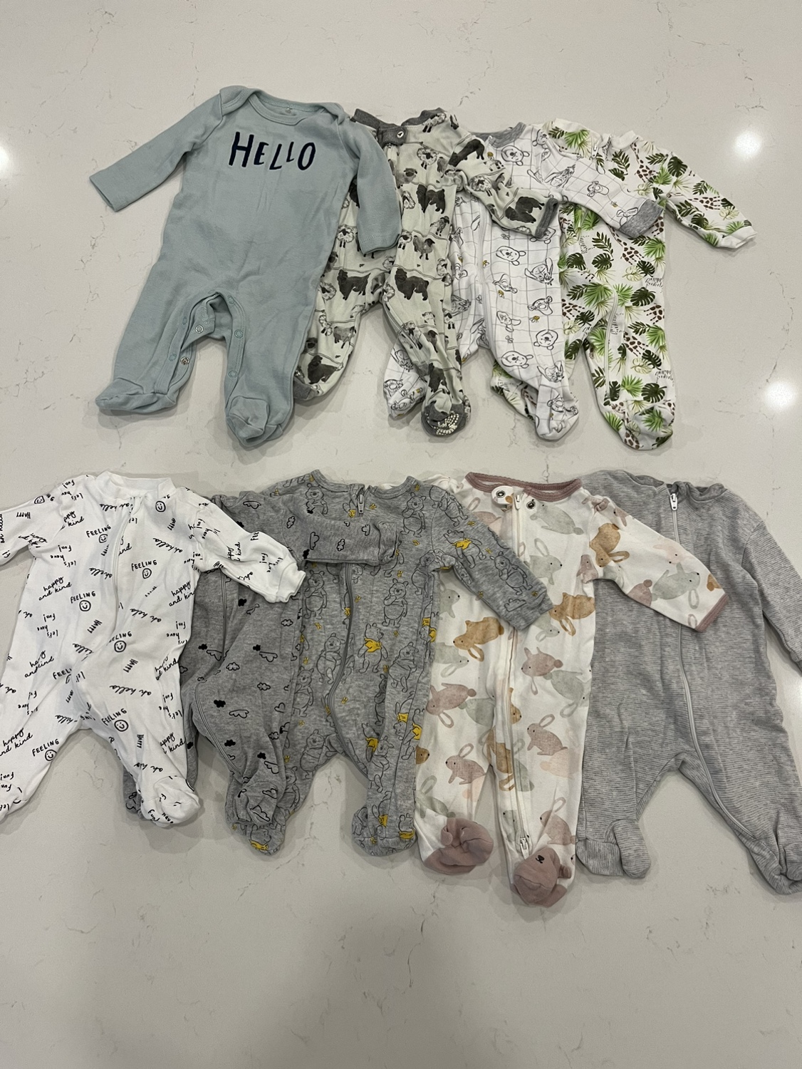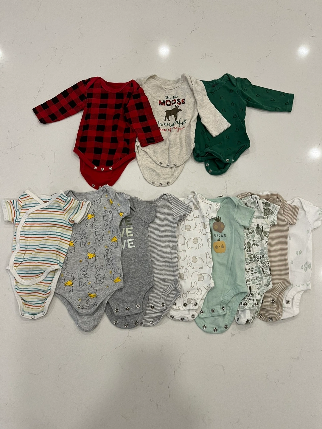 A bundle of baby clothing in like new condition. Size is 0-3 months. All items have been washed and are in good condition.