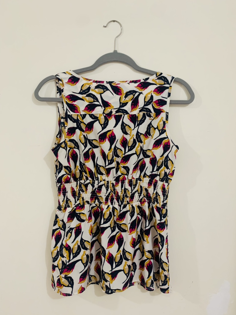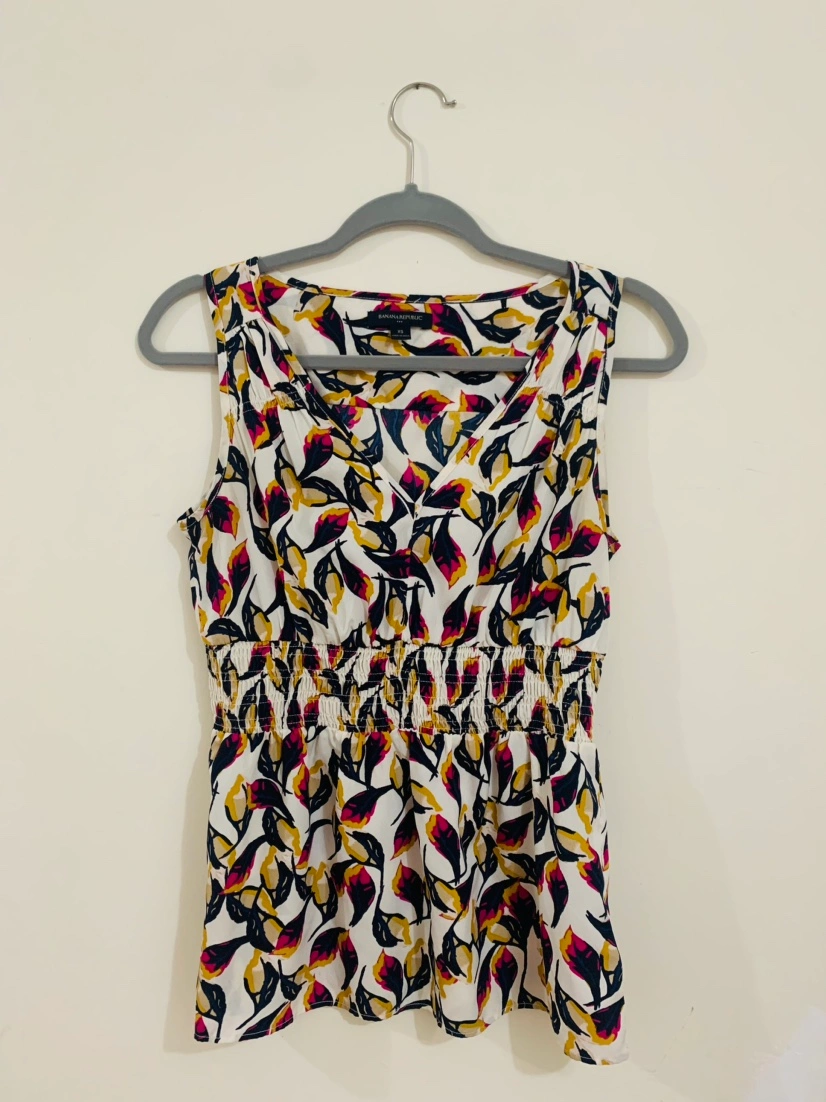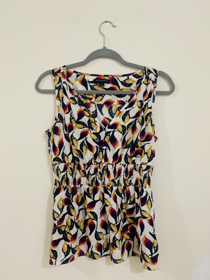 Size XS sleeveless top with a floral pattern. The top has an elastic waistband and a V neckline. Made in India. New, never worn but no tags Cash or etransfer accepted Porch pick up at 16th Avenue & Hwy 48 (Markham Rd) Willing to meet at mutual agreed location Please feel free to ask any questions