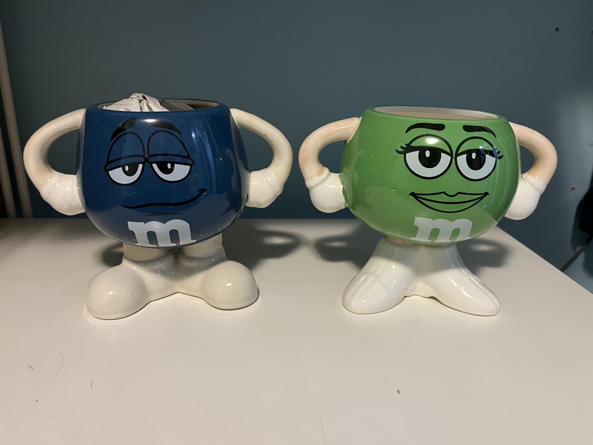 Set of two M&M ceramic mugs. The mugs are shaped like the M&M characters, blue and green. They have handles and white feet. They are in good condition.