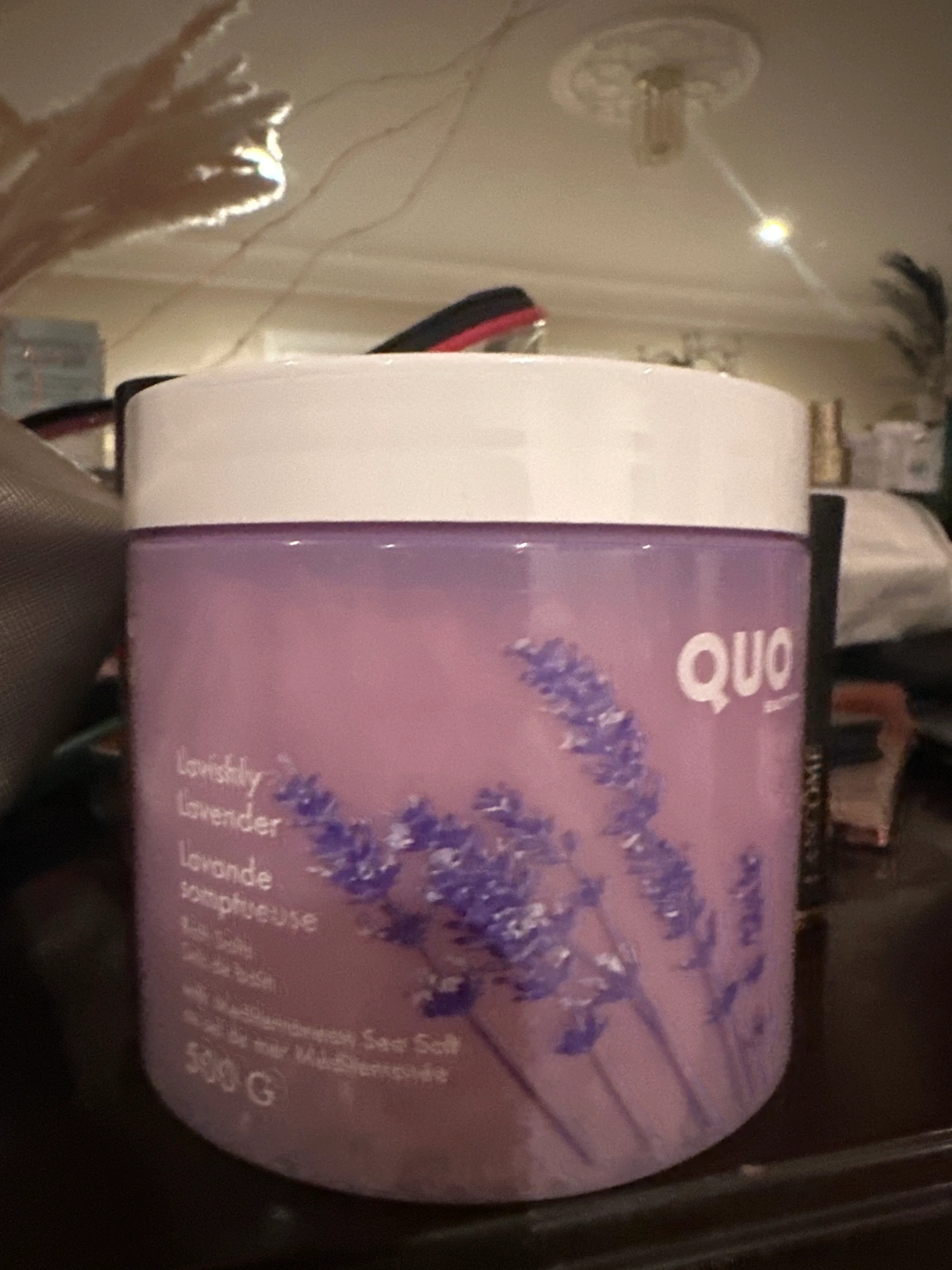 A jar of Quo Lavishly Lavender Bath Salts with Mediterranean Sea Salt. 500 g. Just opened but never used ! So technically new !