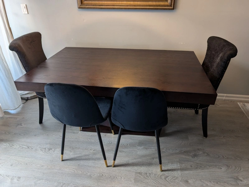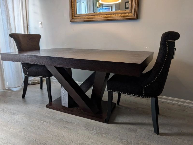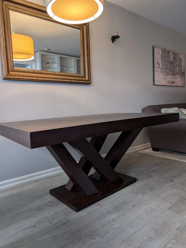 This beautiful wood dining table is from the furniture company Casa Life. It sits up to 8 people and has a nice modern pedestal. It has a dark finish in the table. Moving out and we can't take this table with us. Looking to sell promptly so make me an offer.