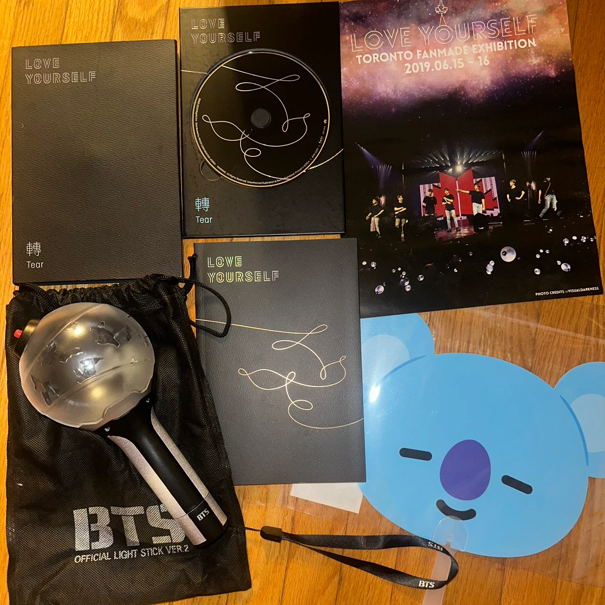 BTS third album Love Yourself Tear (CD and photo book, new, gifted to me by a friend who had two copies). This is the BTS Light Stick Version 2. It comes with a bag, and the light stick is in good and operating condition. Comes with a BT21 character fan from Korea (new, unopened) and a poster from the Toronto fanmade exhibition. Throwing in 2 photo cards! BTS BUNDLE