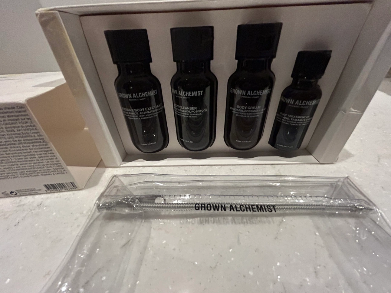 308Set of 4 travel size Grown Alchemist products. Comes with a clear pouch for travel. Grown alchemist body travel kit. Contains travel size body exfoliant, body cleanser, body cream, body treatment oil. 1.69 fluid ounces per item. Beautiful skincare line. Please scroll through my listings for a great selection of designer fashion, trendy fashion, high end skincare and makeup and beautiful kitchen and homewares. Always adding new great items so please follow and take a look! Bundles: if you buy more than 2 items, I may be able to discount your bundle further, depending on the items. Please ask.
