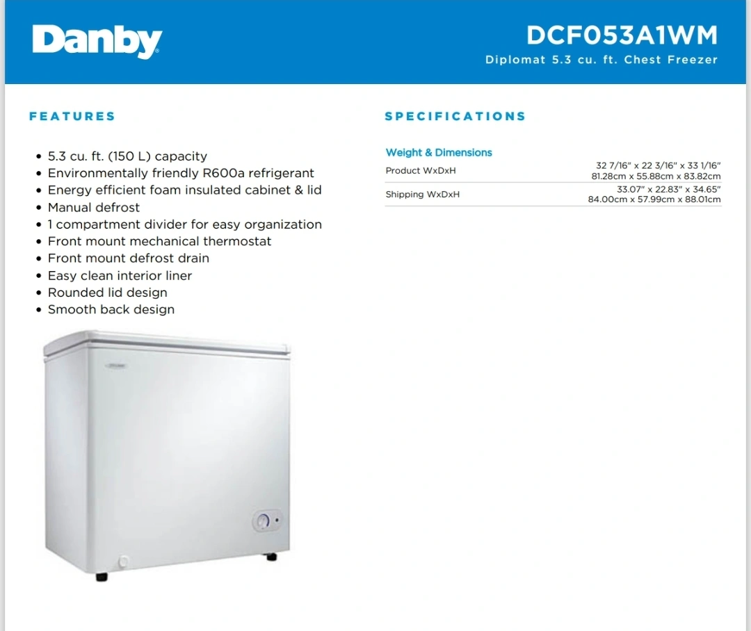 5.3 cubic feet (150 litres) capacity Energy-efficient, foam-insulated freezer cabinet and lid. Rust-resistant and easy-to-clean interior liner.