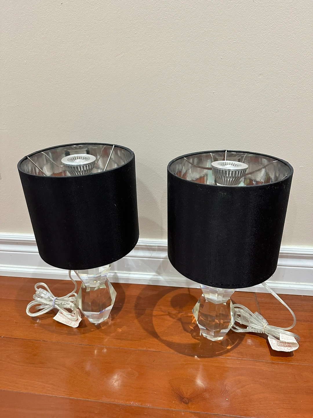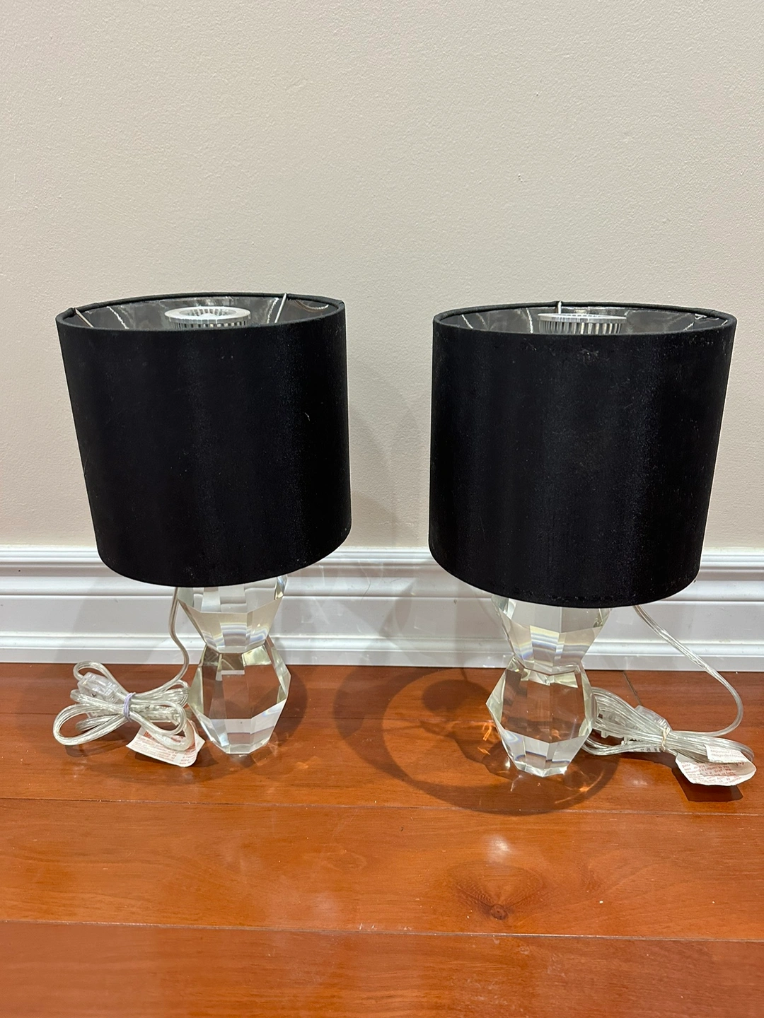 Set of two crystal table lamps with black fabric shades in great condition. They are both wired and in working order. Both going for $30