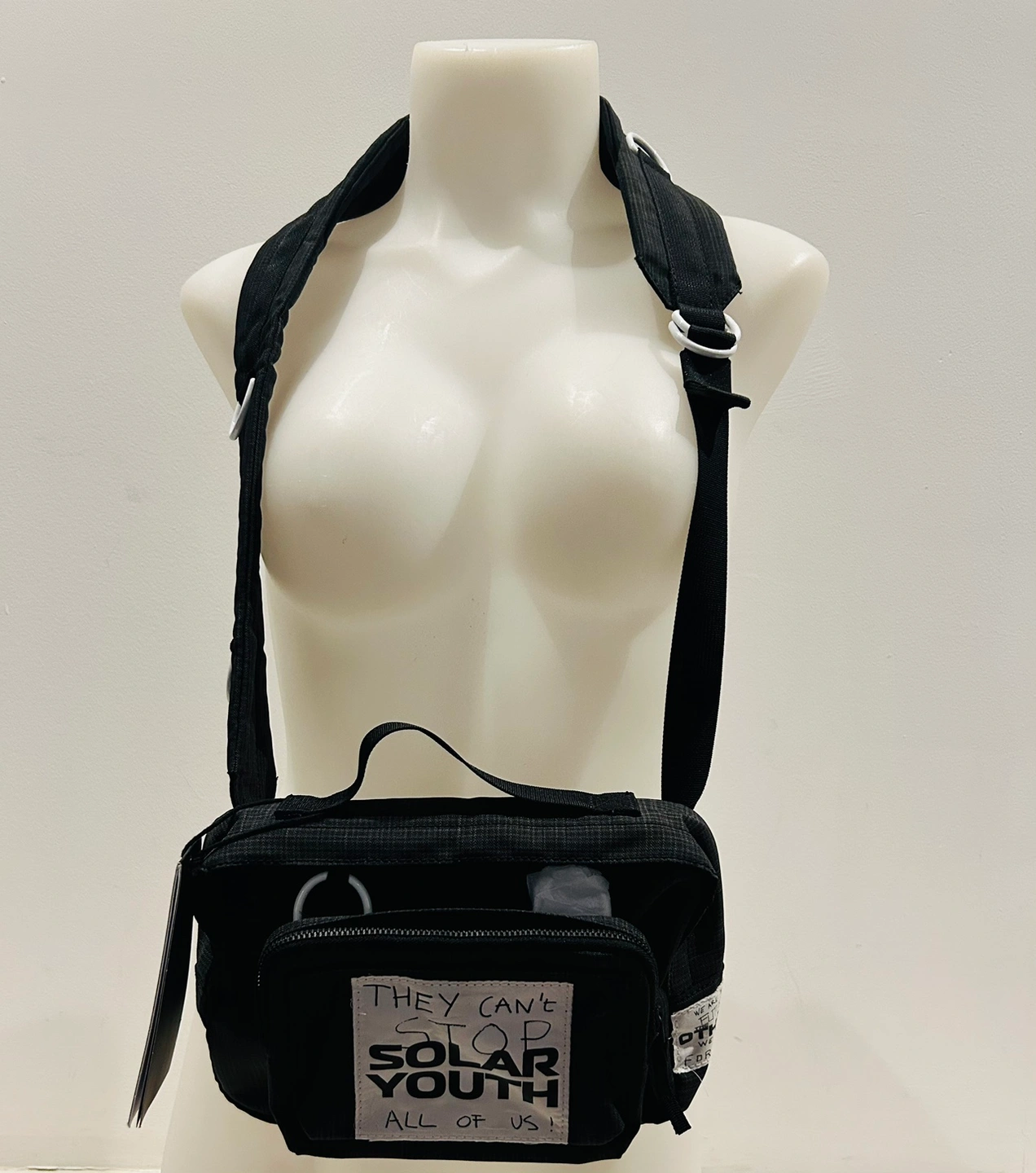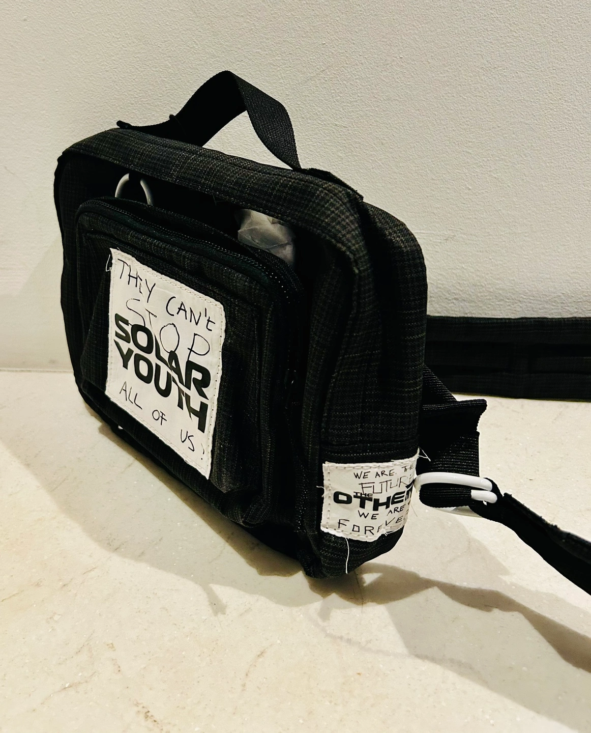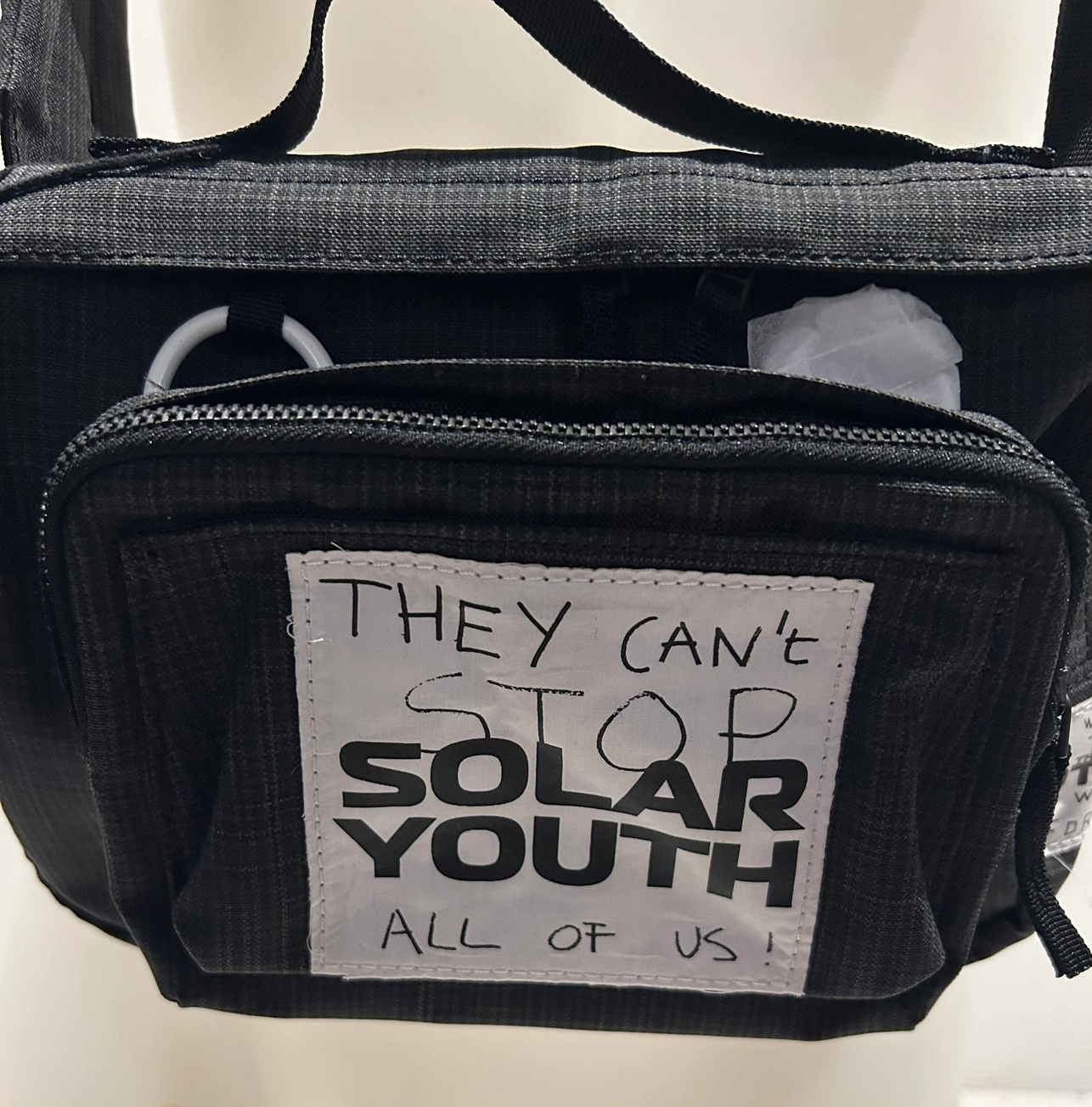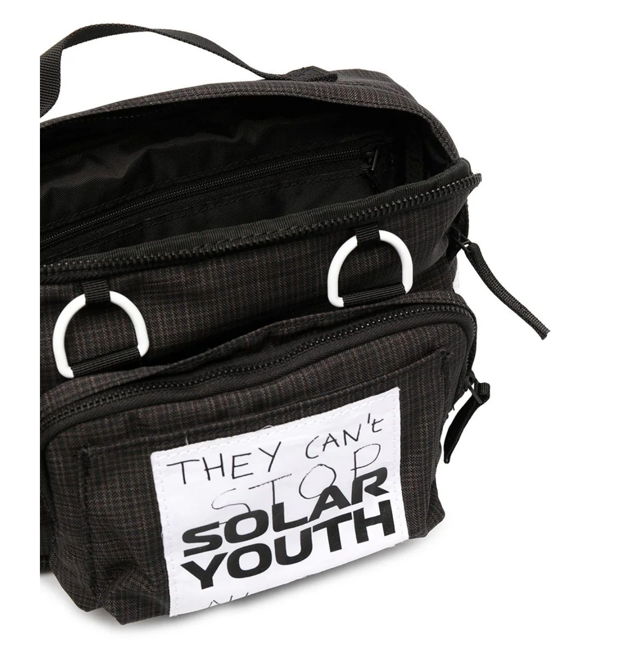 Small black bag with a white "They can't stop Solar Youth" patch. Has a zippered pocket on the front and a main compartment with a zipper. New never worn “Solar Youth” RAF SIMONS eastpac cross body tote bag. Unisex. #rafsimons #eastpac #bag #solaryouth