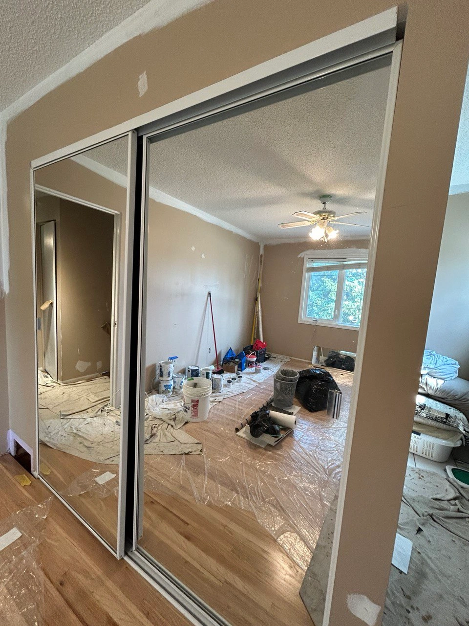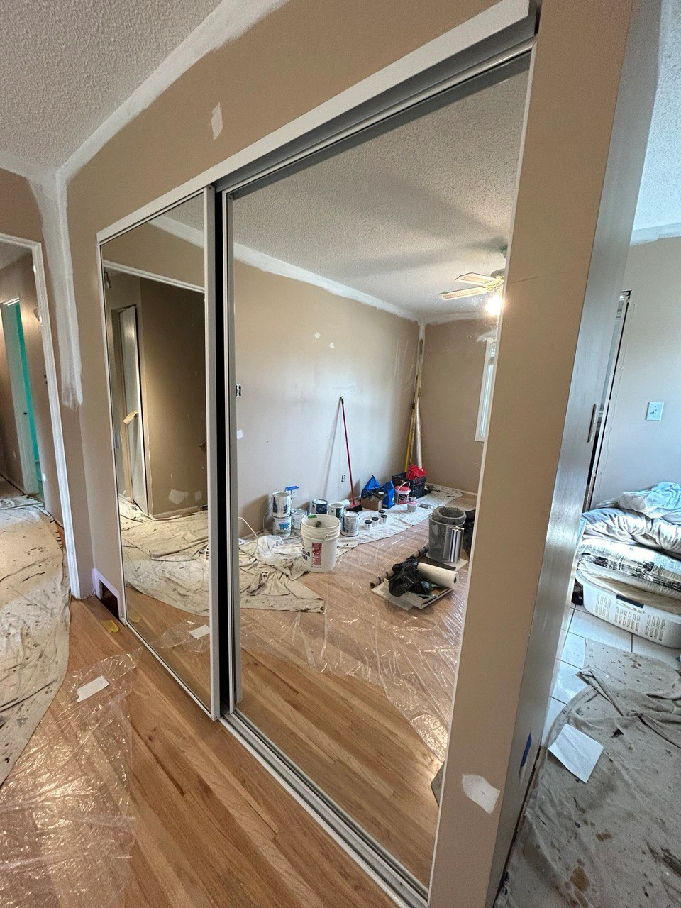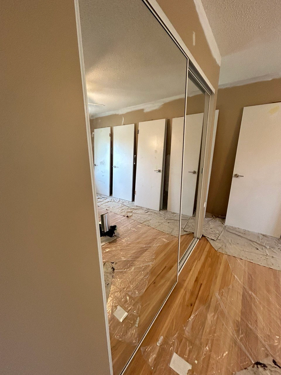20Two mirrored sliding closet doors. The frame is white and the doors are in good condition. They are easy to operate and slide smoothly. They measure 78 inches high by 42 inches wide.