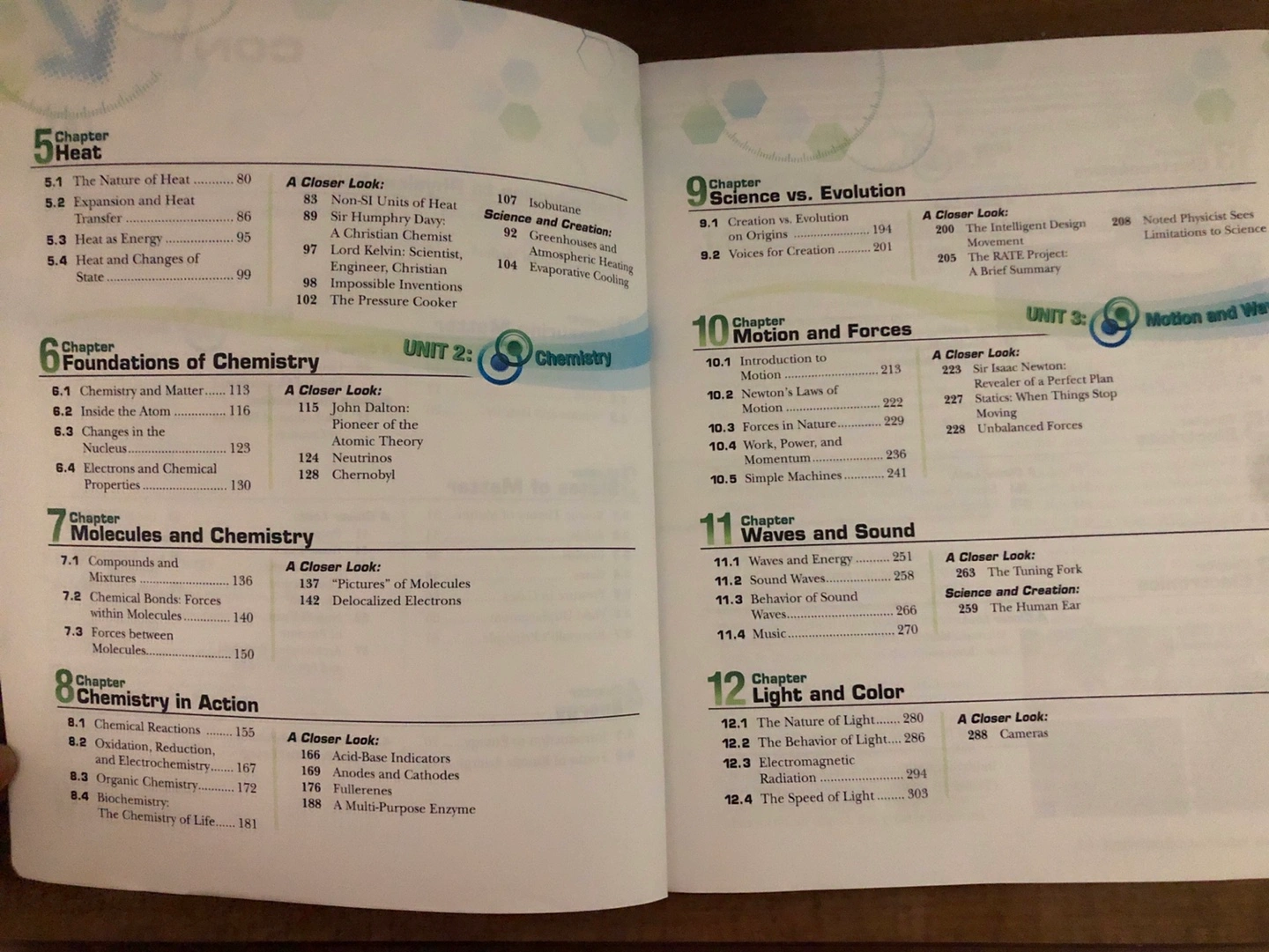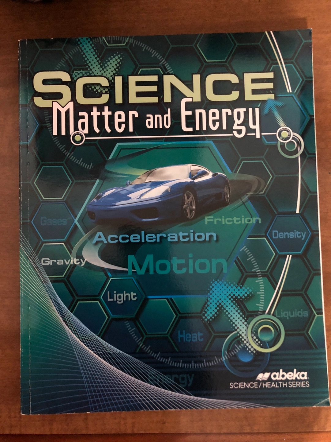 A textbook for middle and high school science students. The book is an Abeka textbook and covers concepts including states of matter, energy, heat, chemistry, motion and forces, waves and sound, and light and color. The textbook is paperback and in good condition.