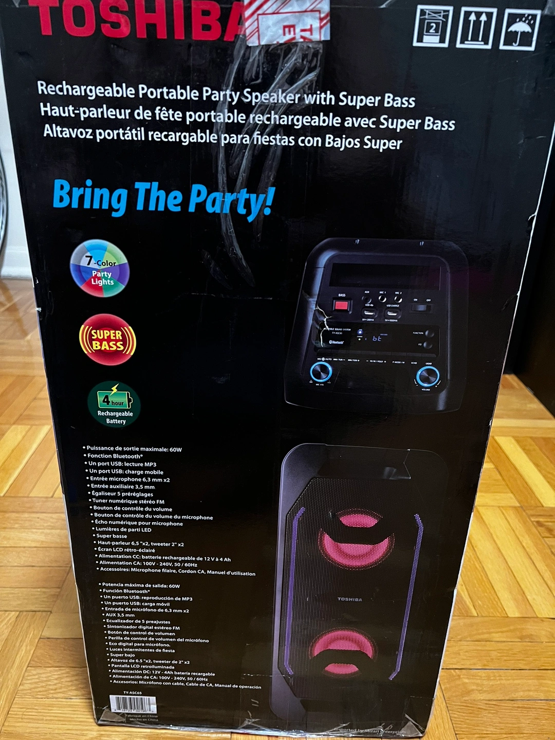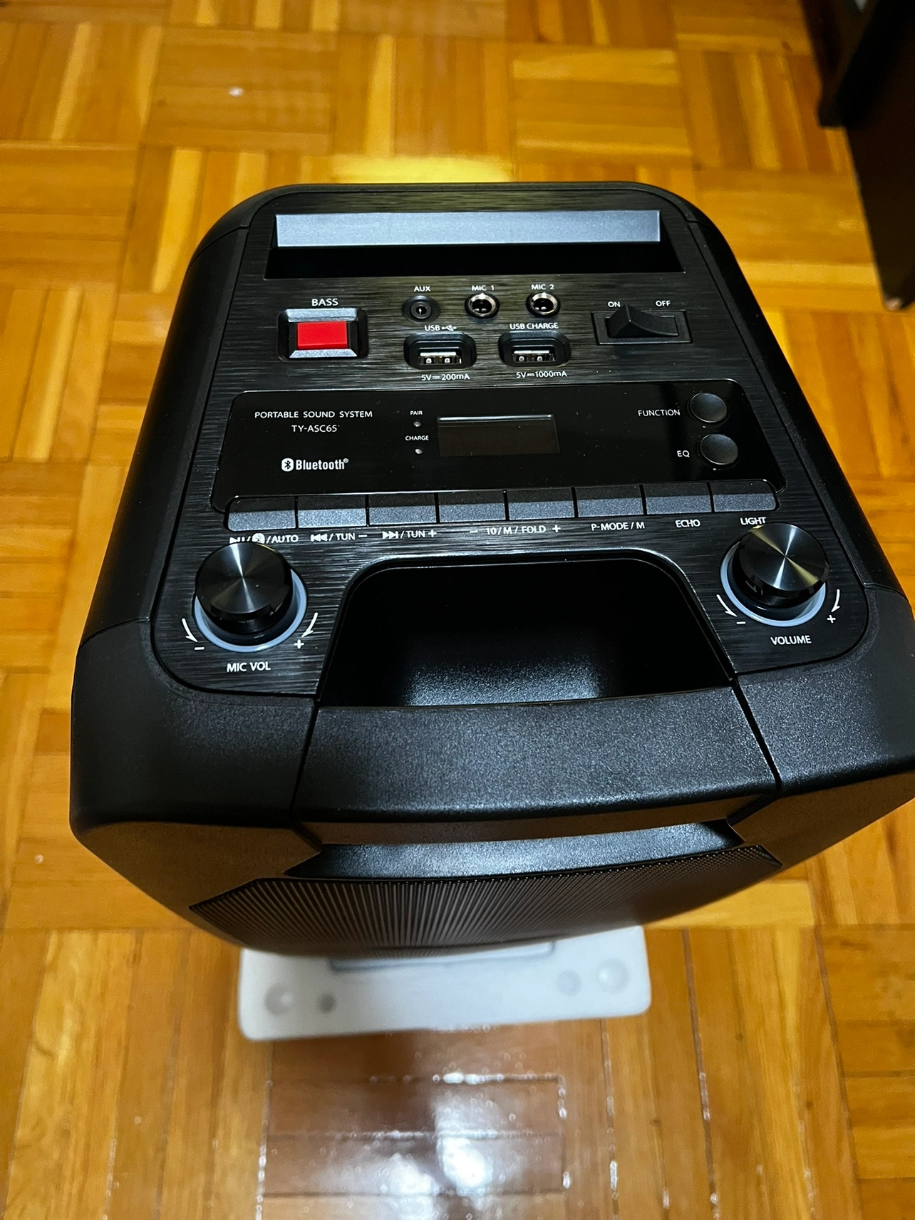 Portable Bluetooth Speaker with multiple input options, including USB, SD card, aux, and microphone. It also has a built-in rechargeable battery. Features bass and echo control, as well as an equalizer.