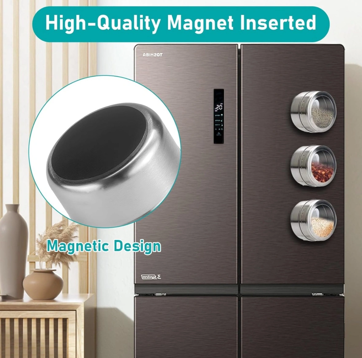 Two small magnetic spice jars with clear lids. Perfect for storing spices or herbs. The magnetic bottoms allow for storage on the refrigerator. Each jar has a hole in the lid to allow for easy pouring of contents.