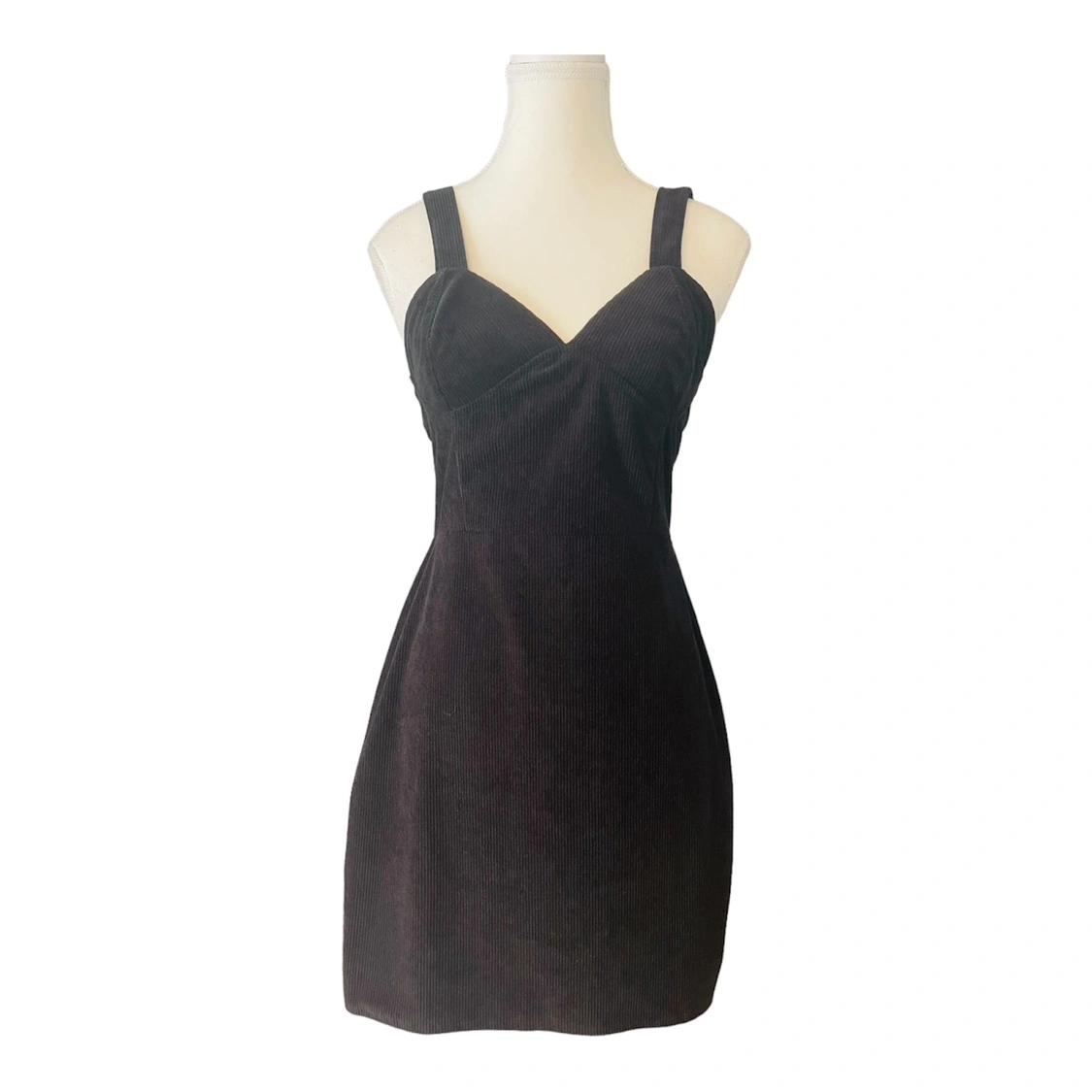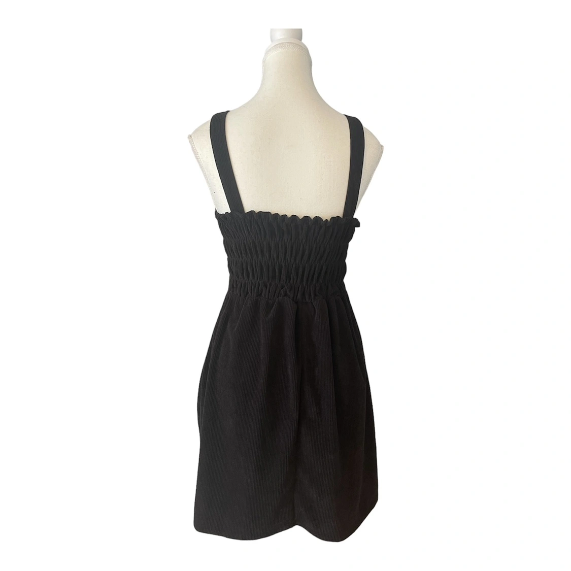 A black mini dress with adjustable straps and a fitted bodice. The dress is made of a soft, comfortable corduroy fabric. It has a flattering A-line silhouette. The dress is perfect for a casual or dressy occasion.