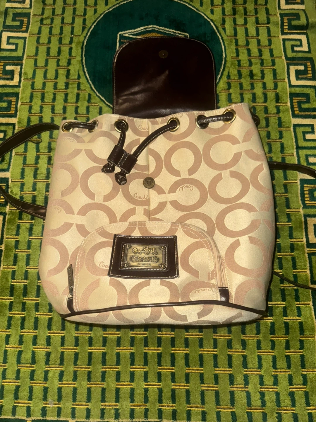 Selling a Coach Ergo Drawstring Backpack. It features the classic Coach logo pattern in neutral tones, with brown leather accents.