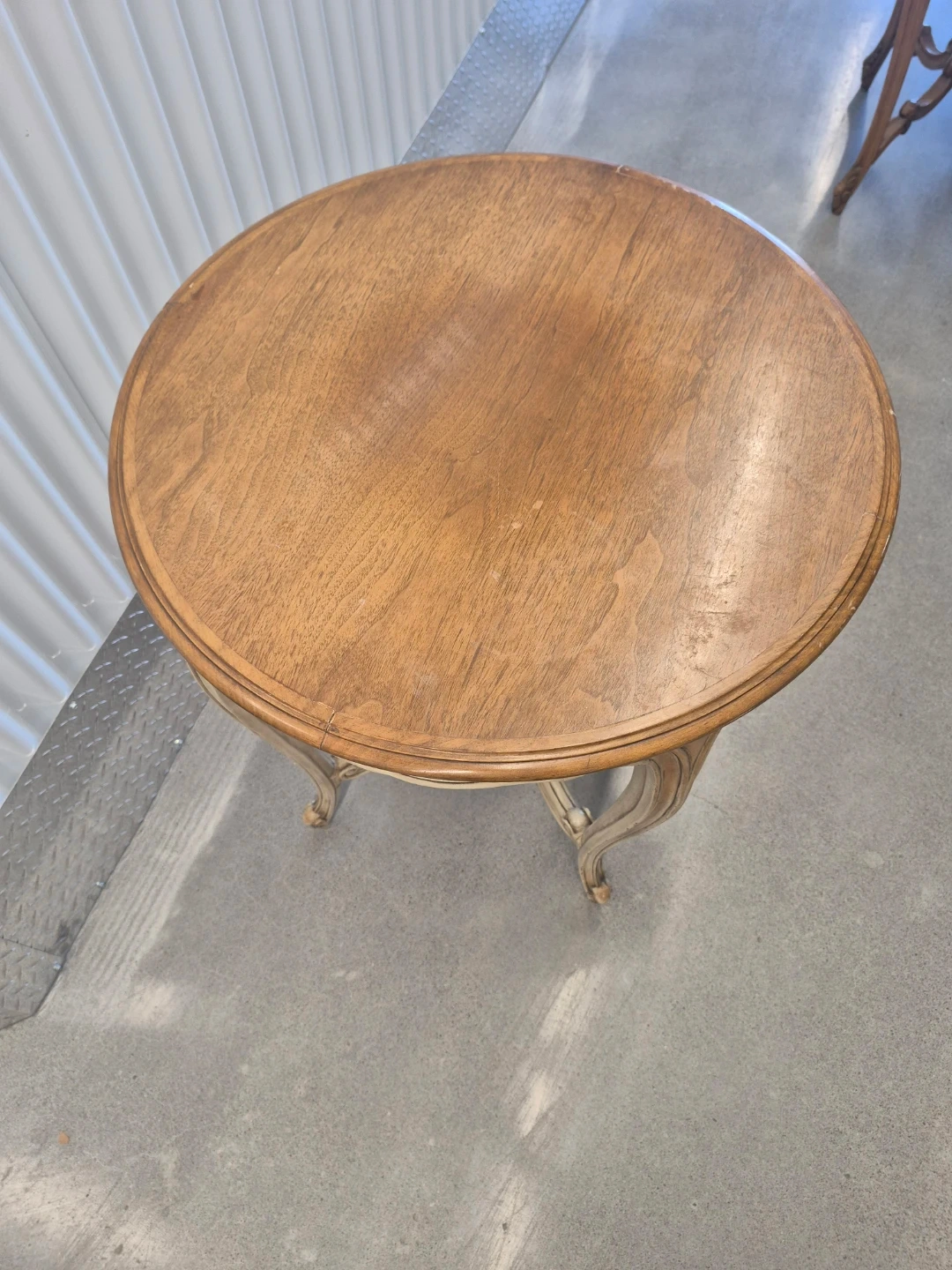 This charming side table features a round wooden top and ornately carved legs, showcasing a distressed cream and wood finish. It's a lovely accent piece for any room. Perfect for holding a lamp or a decorative item!