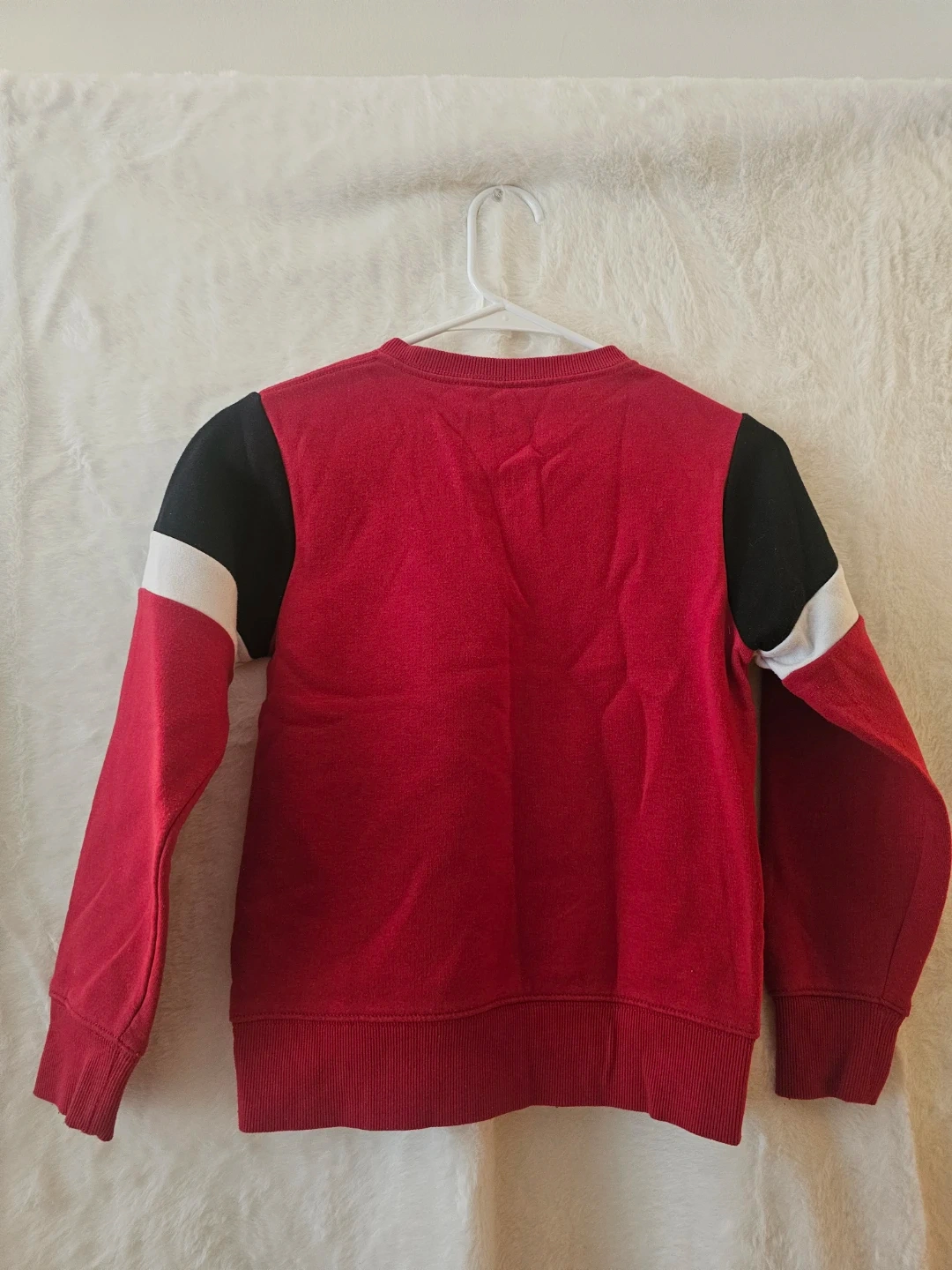 Selling a Jordan kids' sweatshirt in red! It features black and white stripes on the sleeves and the iconic Jordan logo on the front. Perfect for a young basketball fan