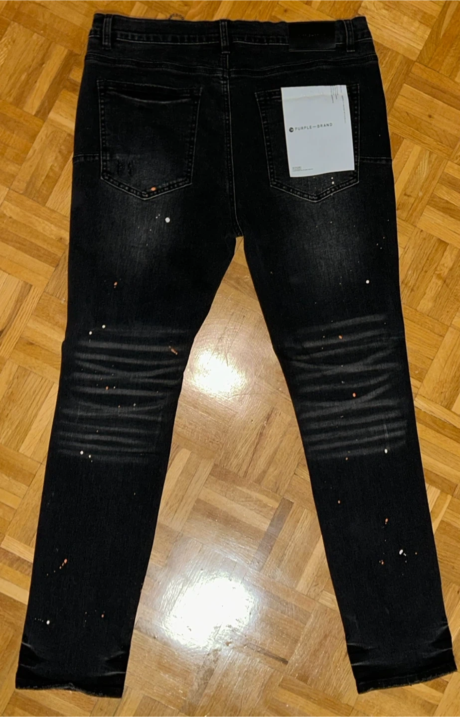 Purple Brand black denim jeans with paint splatter details. These jeans are a size 34. They feature distressed accents and a unique paint-splattered design.