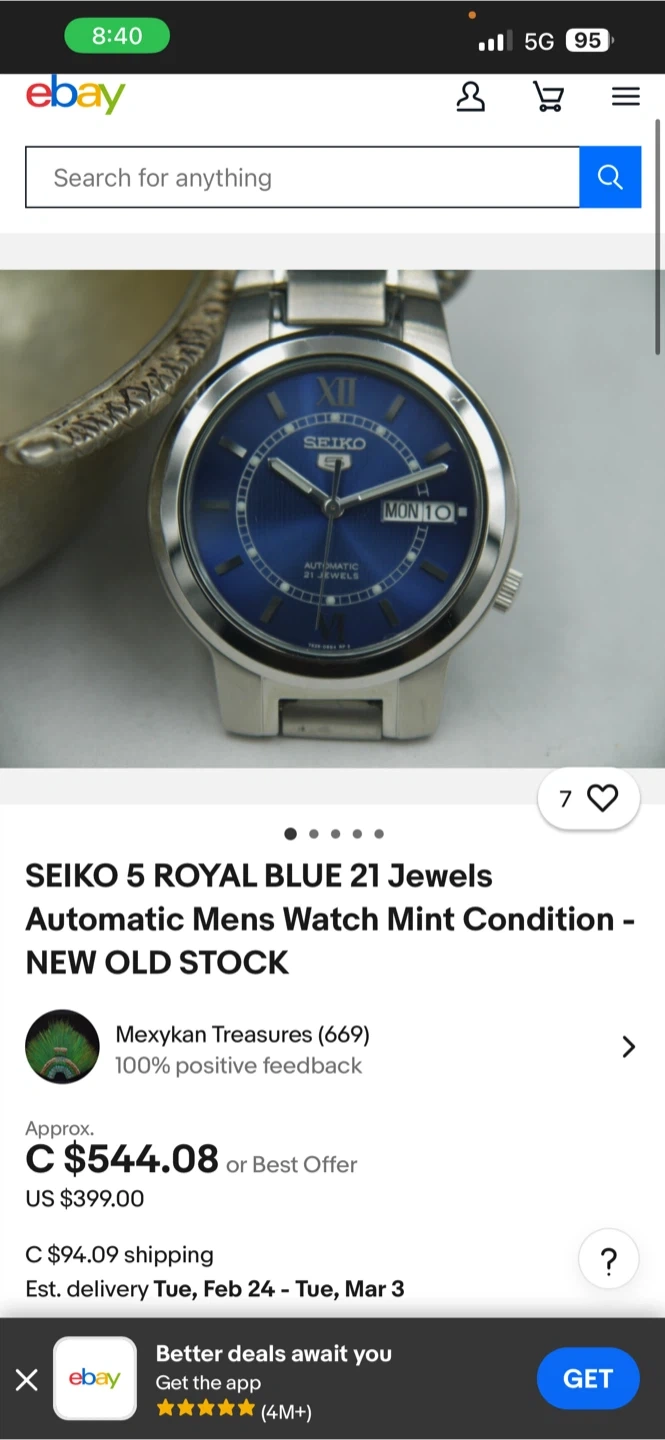 Seiko 5 automatic watch with a royal blue dial. It's a 21 jewels timepiece with a stainless steel band. Water resistance is stated.