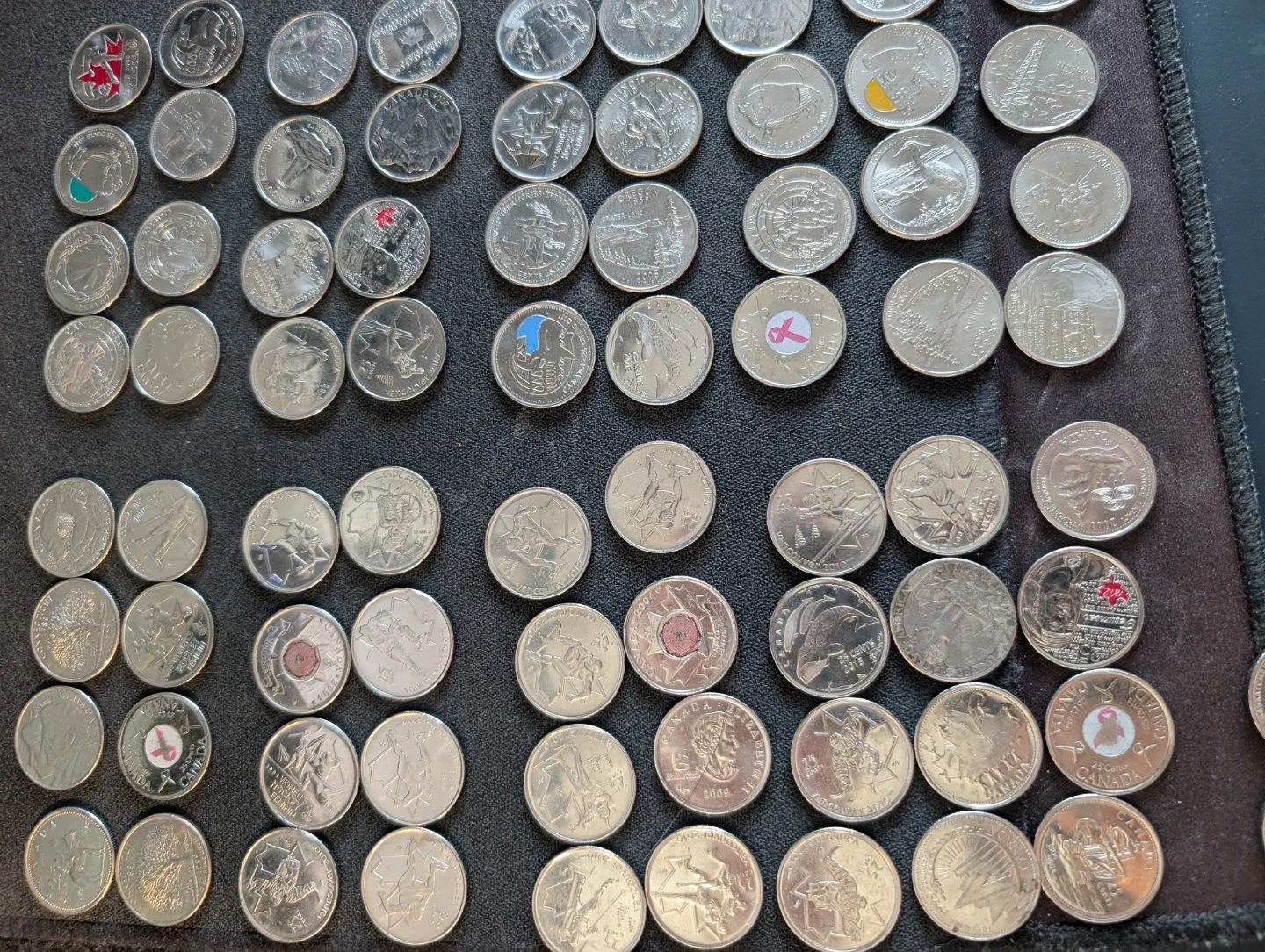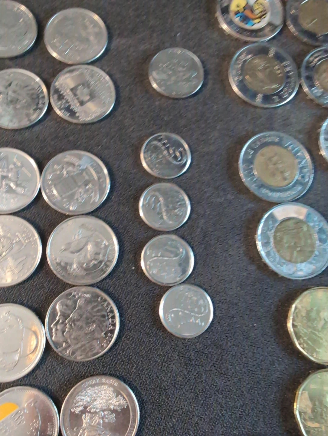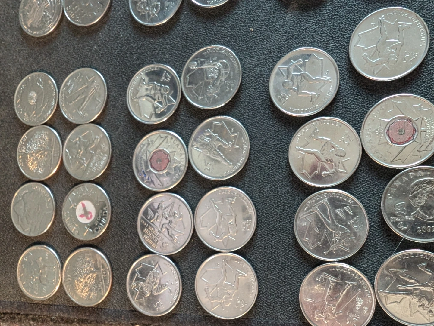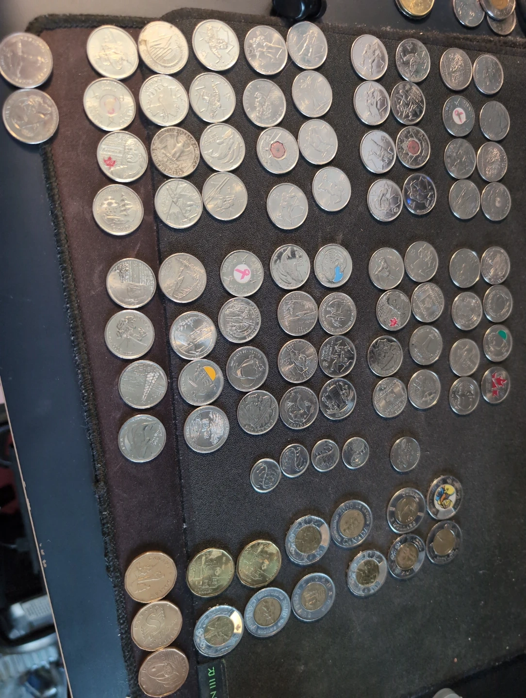 This is a collection of various Canadian coins. It includes toonies, loonies, and other denominations. Some coins feature special designs and commemorative images. These coins are great for collectors or anyone interested in Canadian currency.