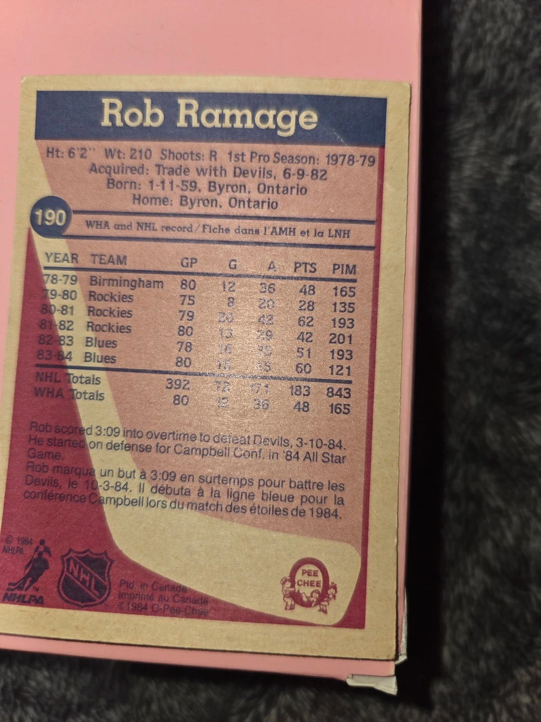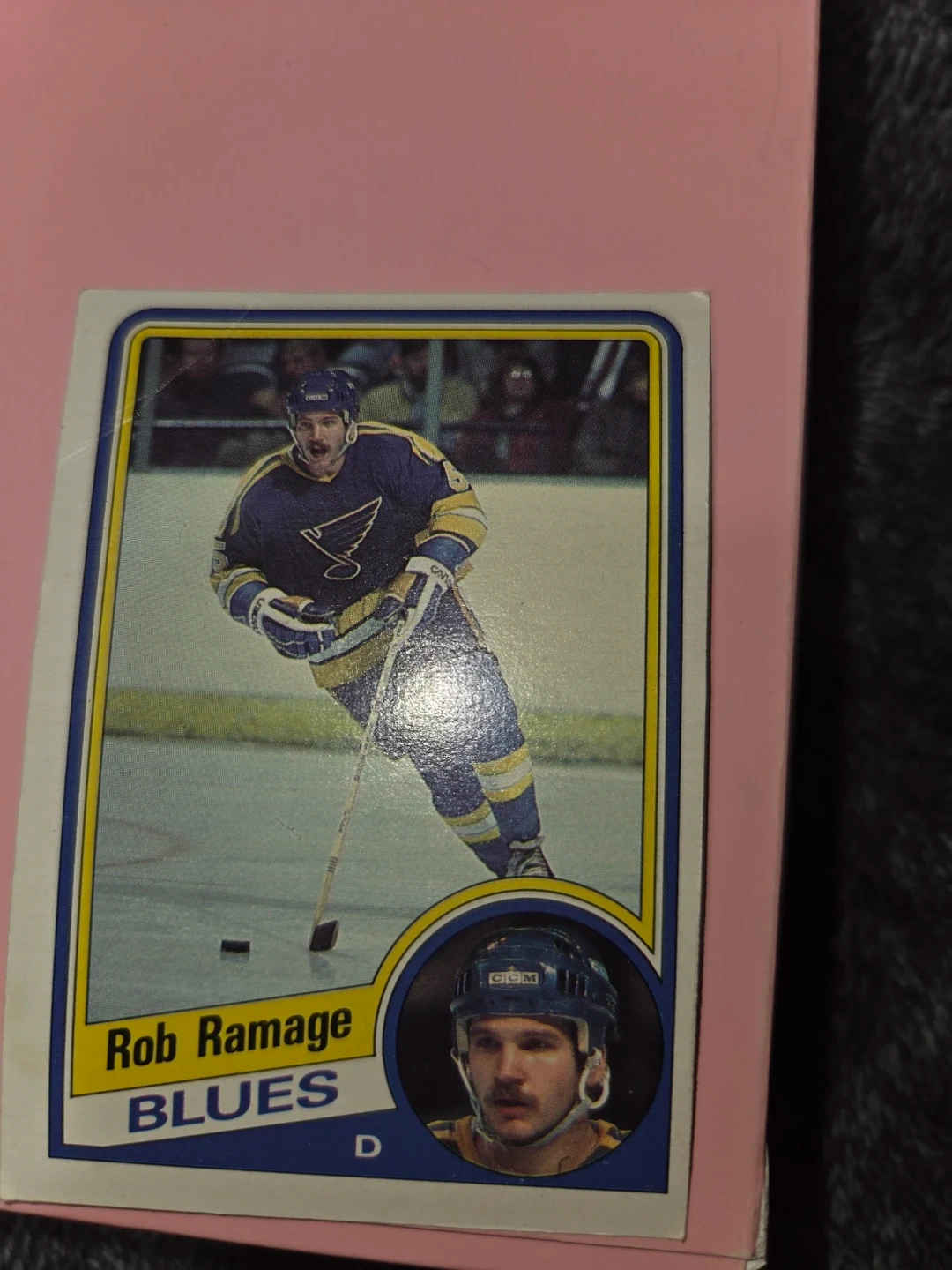 This is a 1984 O-Pee-Chee hockey card featuring Rob Ramage of the St. Louis Blues. It details his career stats. The card is copyright 1984.