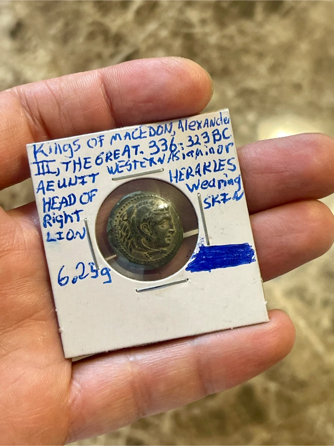 This is an ancient coin from the time of Alexander III the Great, Kings of Macedon, minted between 336-323 BC. It weighs 6.25g and depicts the head of a right lion on one side and a depiction of Heracles on the other.