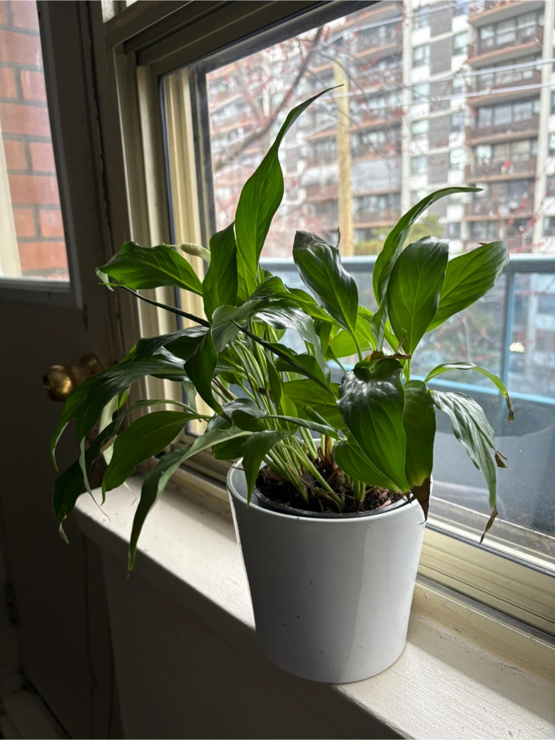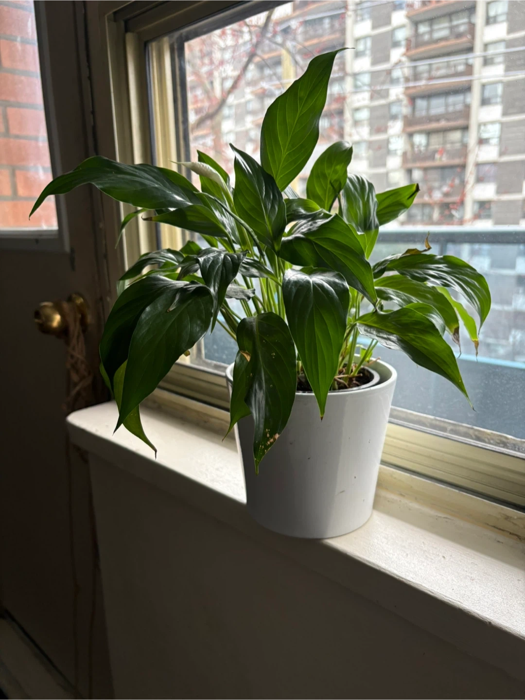 A healthy peace lily plant with lush green foliage is housed in a simple white pot. This plant thrives in low light conditions and is known for its air-purifying qualities. It's a popular choice for indoor spaces.