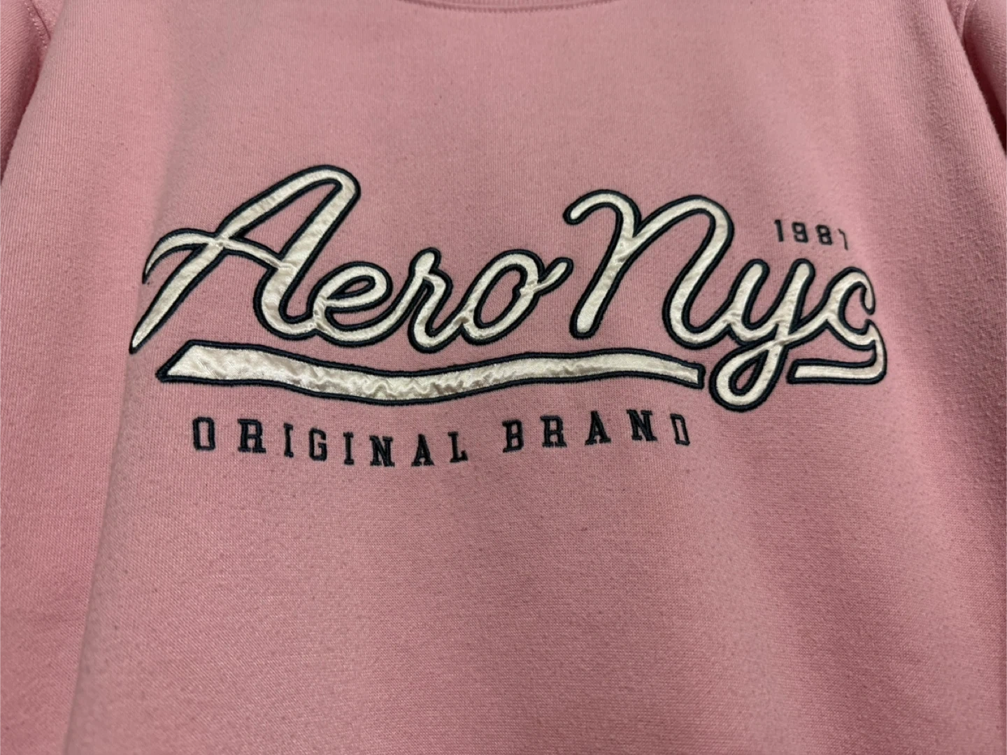 This is a pink Aéropostale crewneck sweatshirt with the "Aero NYC" graphic on the front. It's a size medium. Made in China.