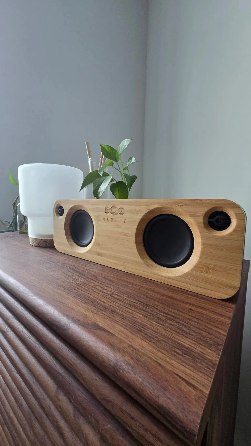 Rechargeable, portable, has aux-in, and made with sustainable materials (wood + recycled plastics).