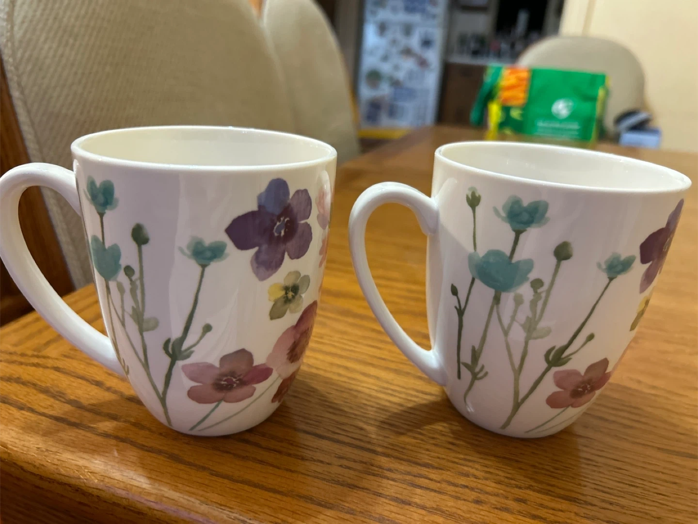 Here's a set of two white ceramic mugs, each adorned with a charming watercolour floral design. They're perfect for enjoying your morning coffee or tea. These mugs would be a lovely addition to any kitchen.