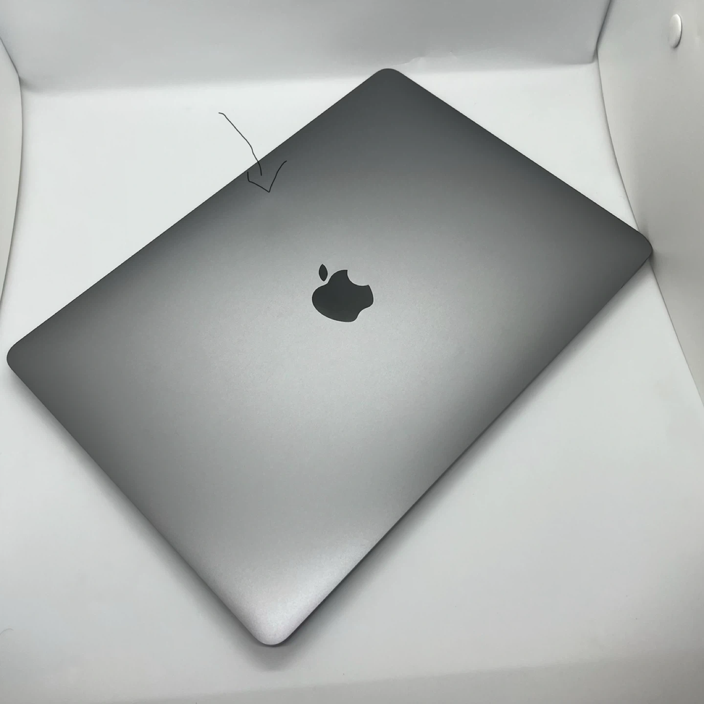 The MacBook also has some visible scuffs, chips, and a small dent/dip on the top and bottom of the laptop (please review photos; an arrow is drawn to show)