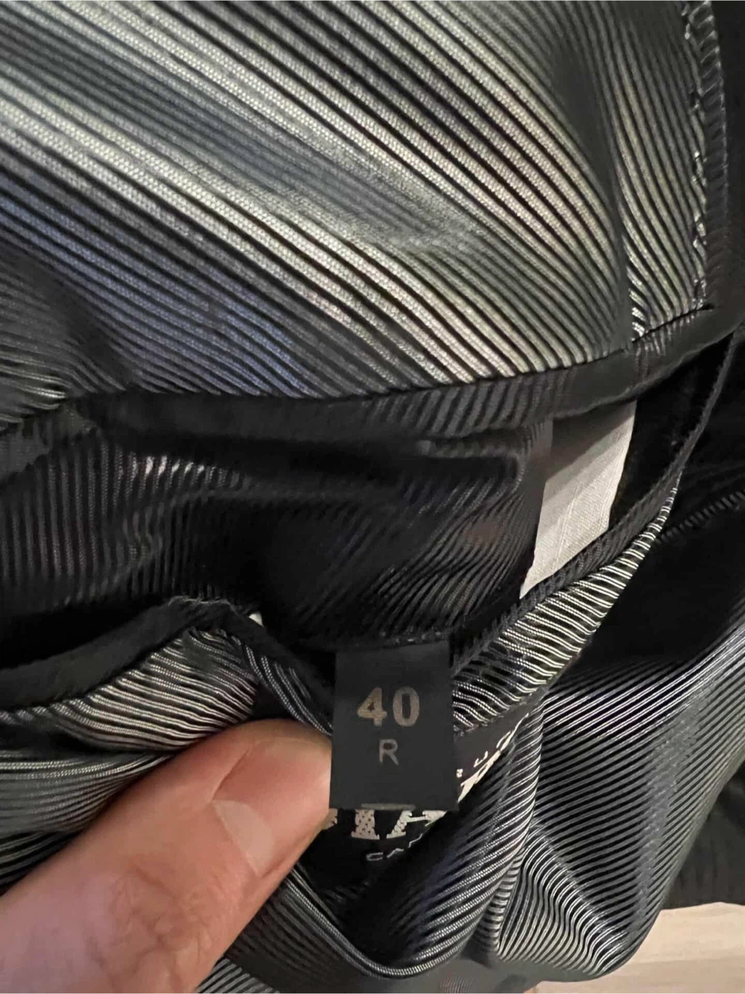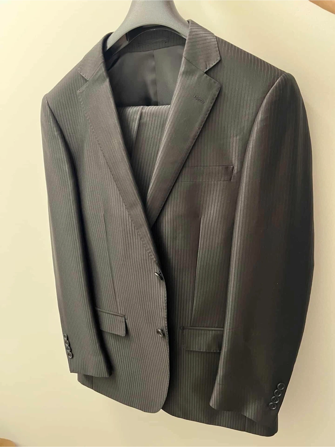 Selling a men's black suit with a subtle pinstripe pattern. It's a size 40R for the jacket and 34R for the pants. This suit is suitable for formal occasions or professional wear.