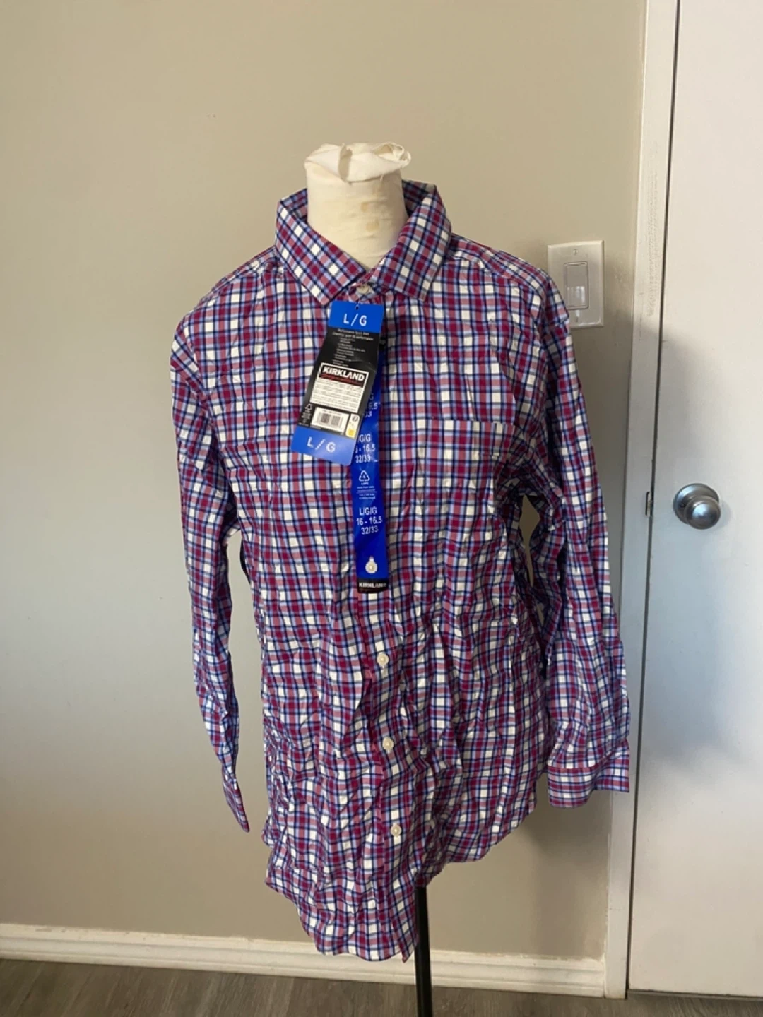 Brand new with tags Kirkland Signature long-sleeve dress shirt. Features a classic plaid pattern in red, white, and blue. Size is Large/Grande. This button-up shirt is great for everyday wear or dressing up.