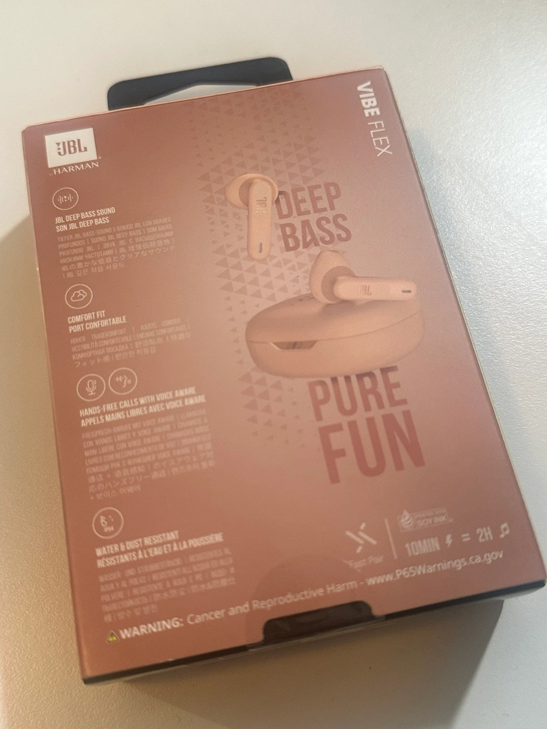 New, unopened JBL Vibe Flex wireless earbuds. Blush pink colour. Features deep bass and a comfortable fit. Water and dust resistant. Includes hands-free calling.