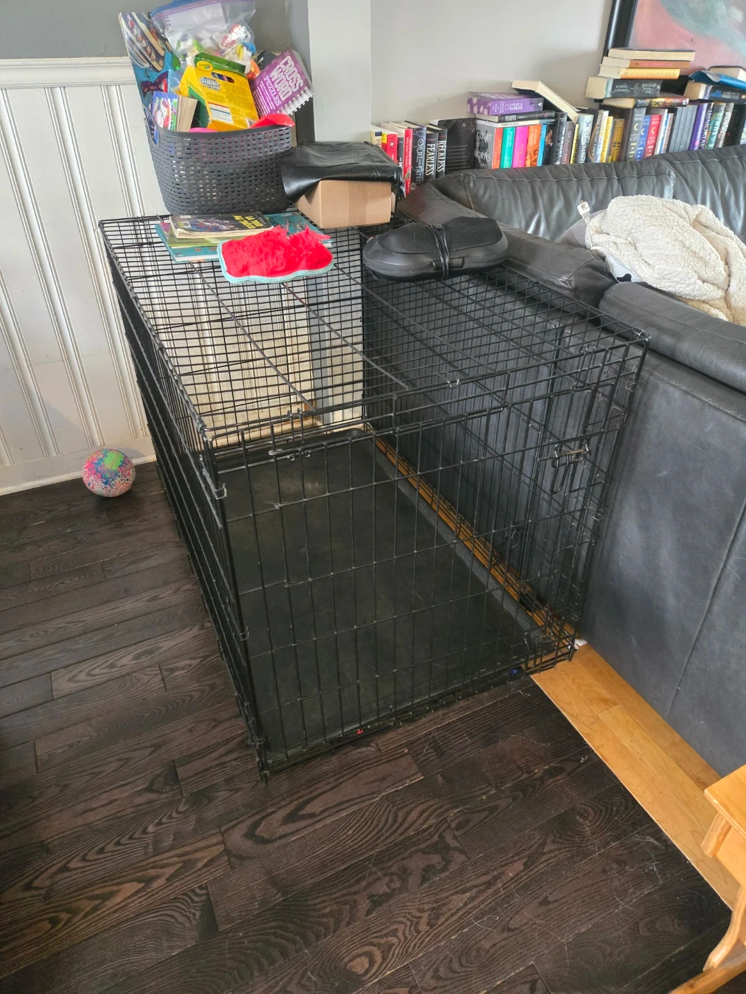 This is a large wire dog crate that comes with a black plastic tray. It's made of durable wire and has a secure latch. This crate would be useful for training or safely containing your pet.