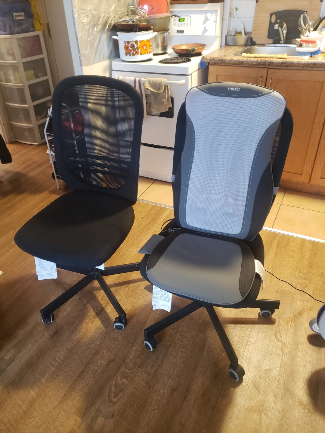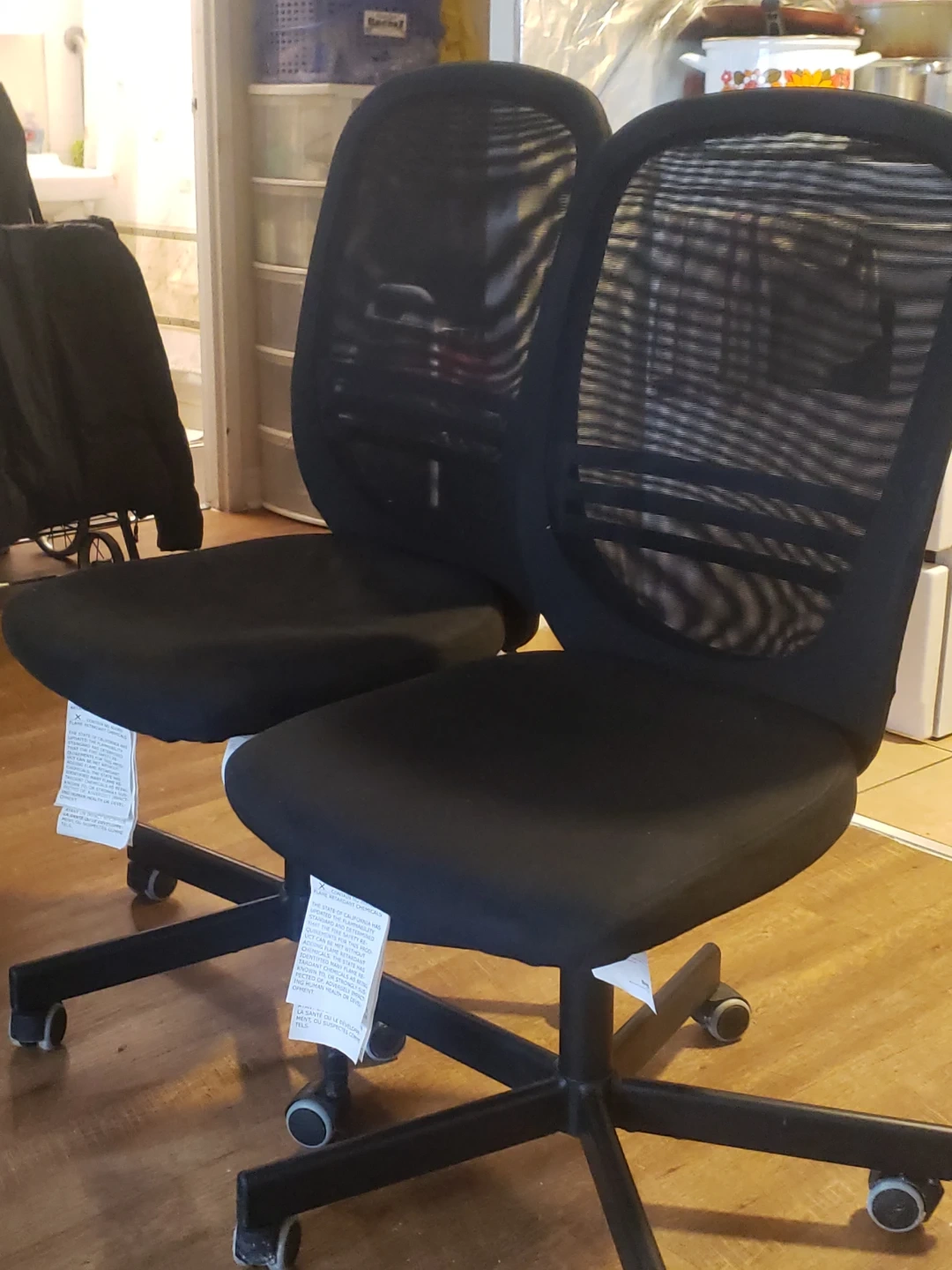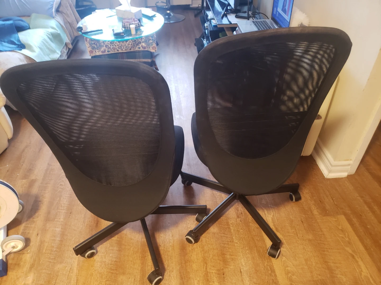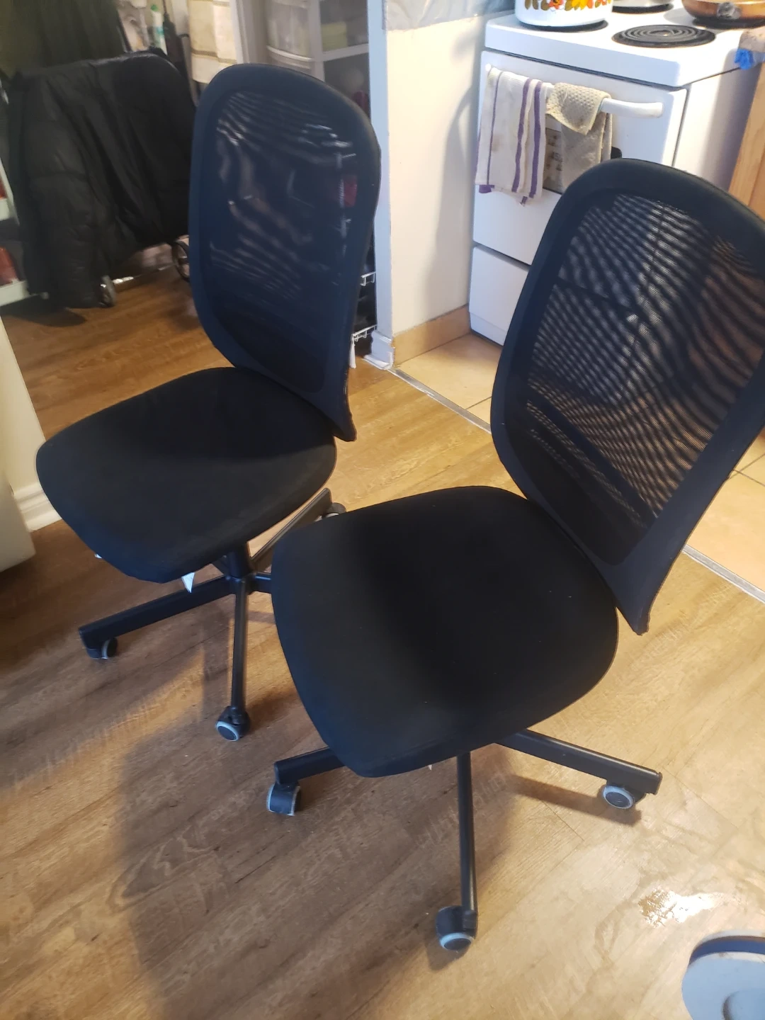 These are two black mesh office chairs. They have a comfortable mesh back it is adjustable up and down and . They're on wheels for easy movement. Perfect for a home office or study space!