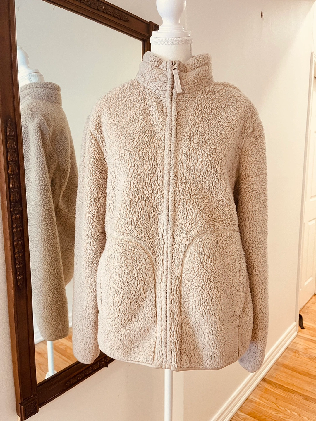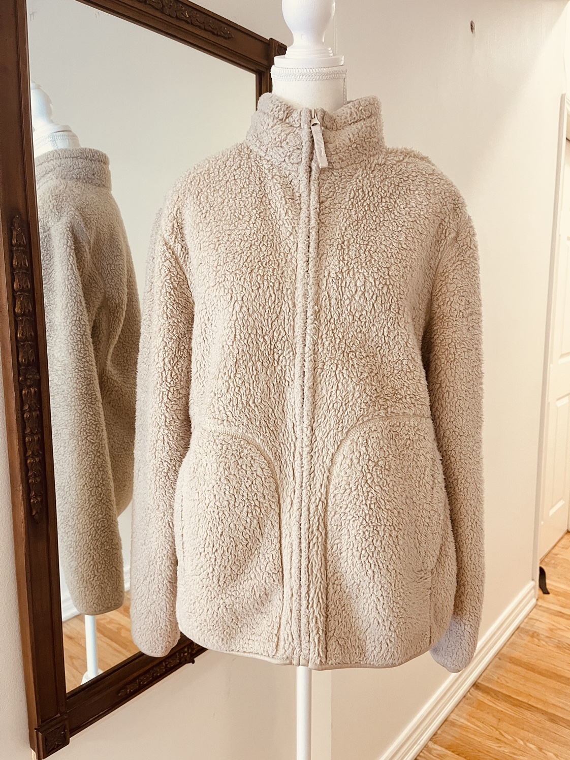 A cream coloured sherpa jacket with a zipper closure. It has a high neckline and long sleeves. It has two pockets at the front.