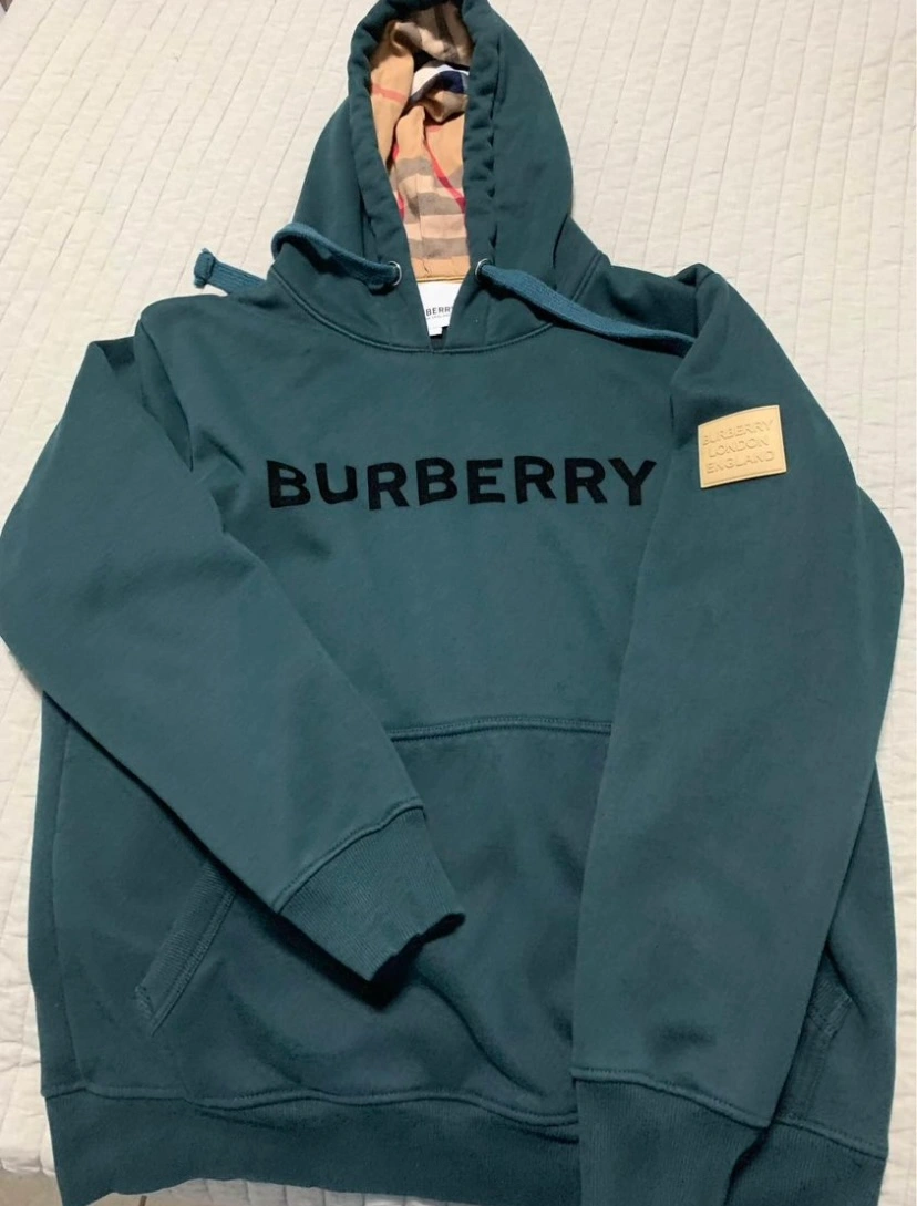Men's size XL Green Burberry hoodie. It features a black logo on the front and a signature Burberry check lining on the hood.